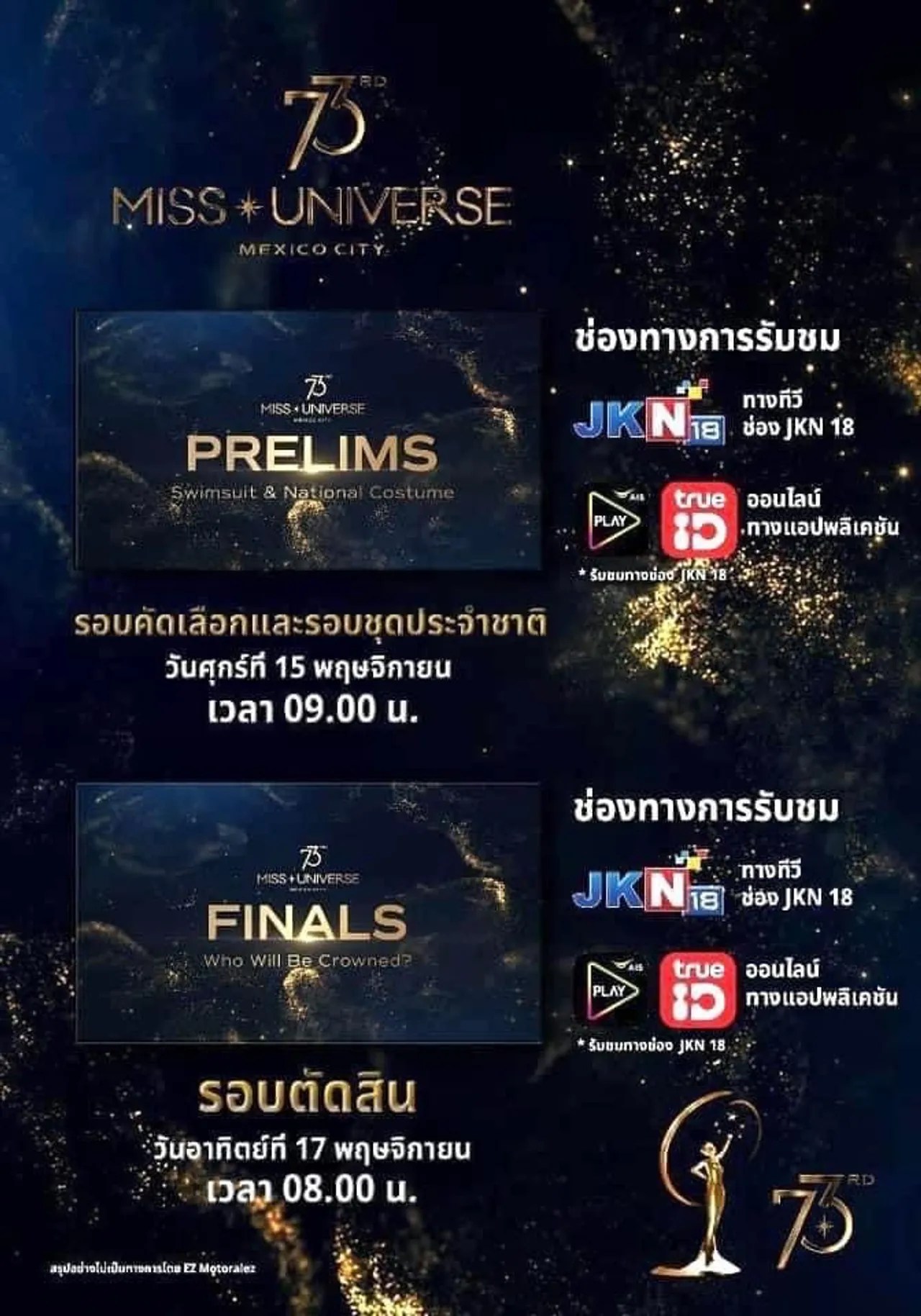 – รอบ Preliminary Competition & National Costume (รอบพรีลิมฯ และรอบชุดประจำชาติ) วันศุกร์ที่ 15 พฤศจิกายน 2567 เวลา 09.00 น. ตามเวลาประเทศไทย