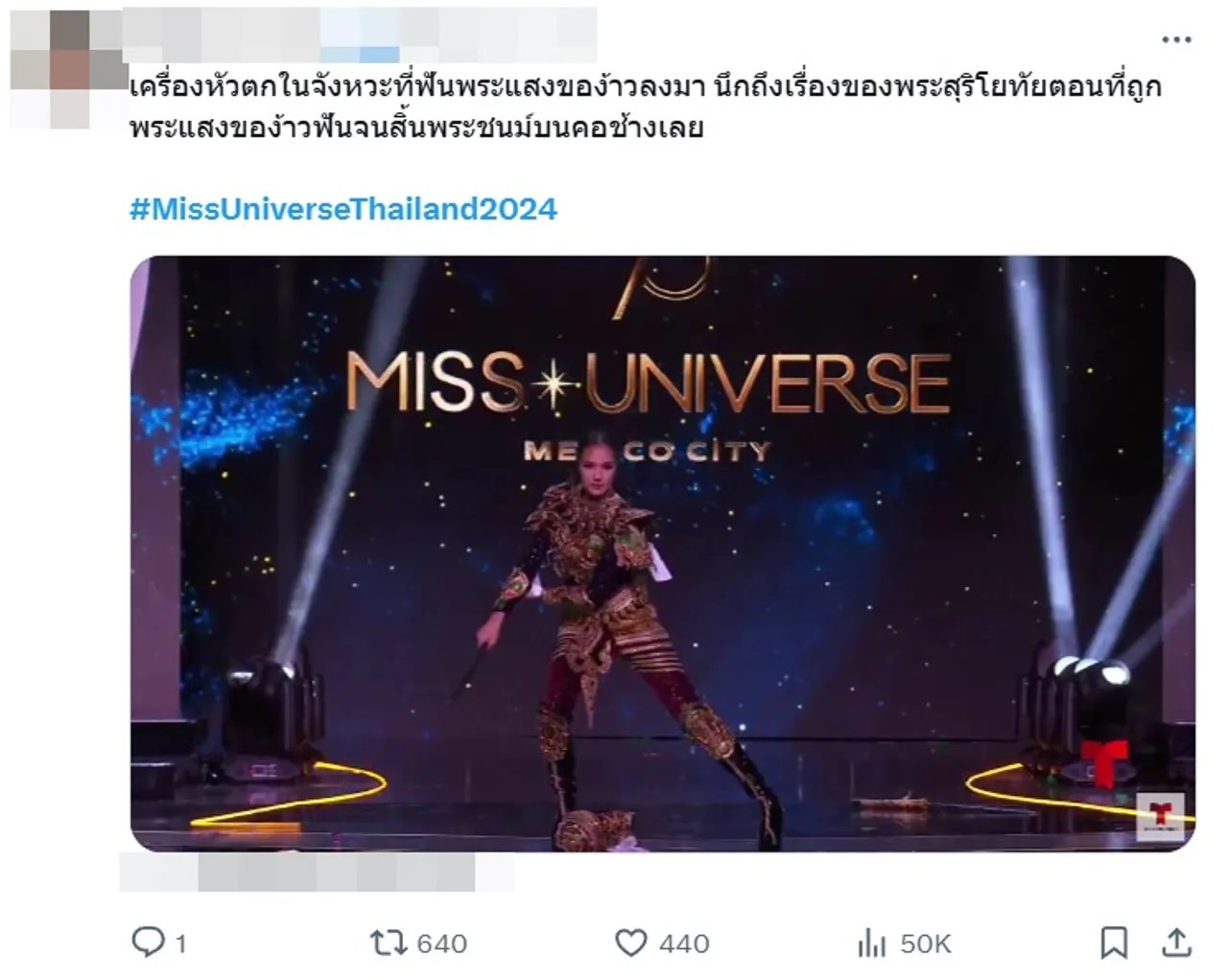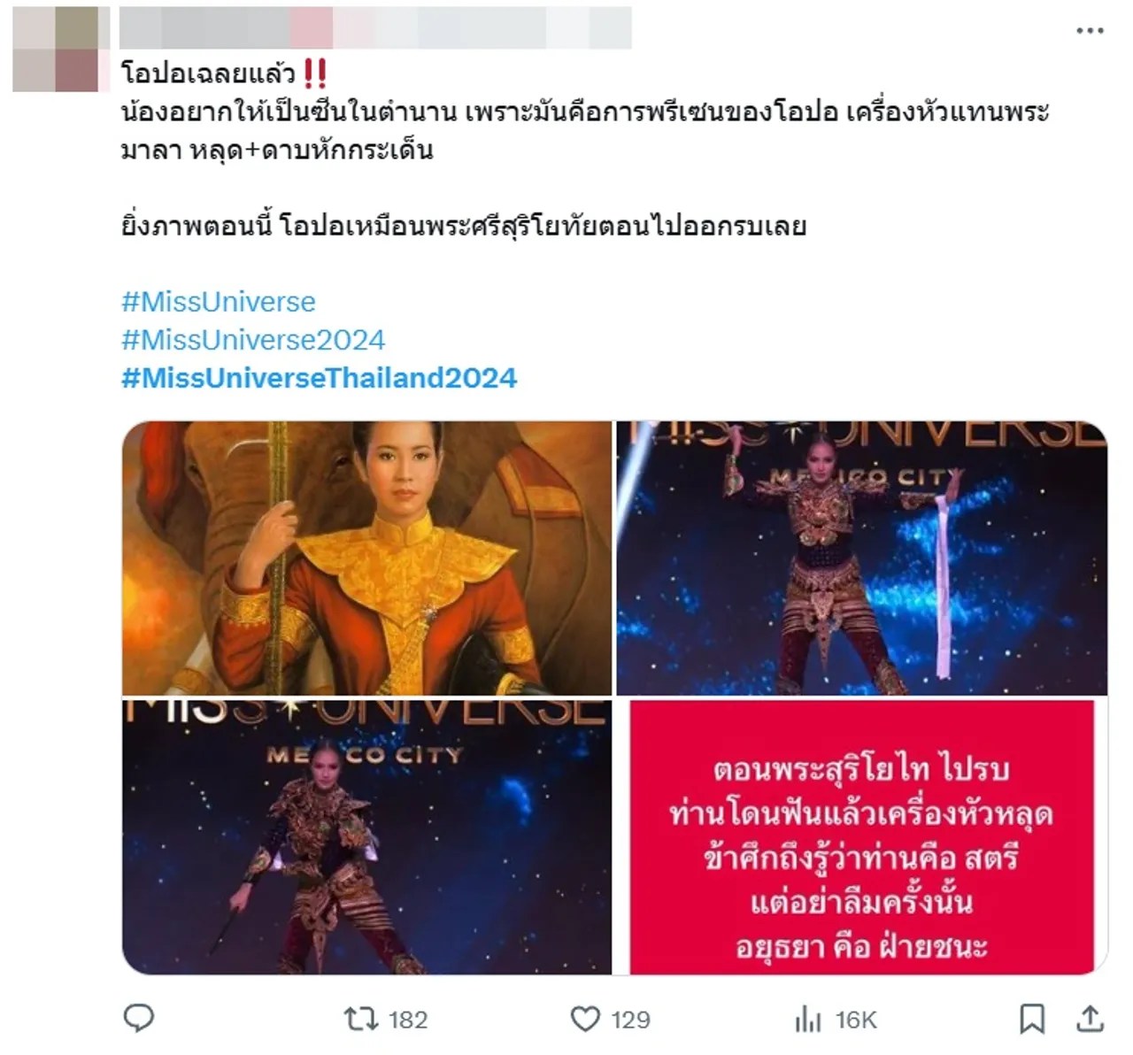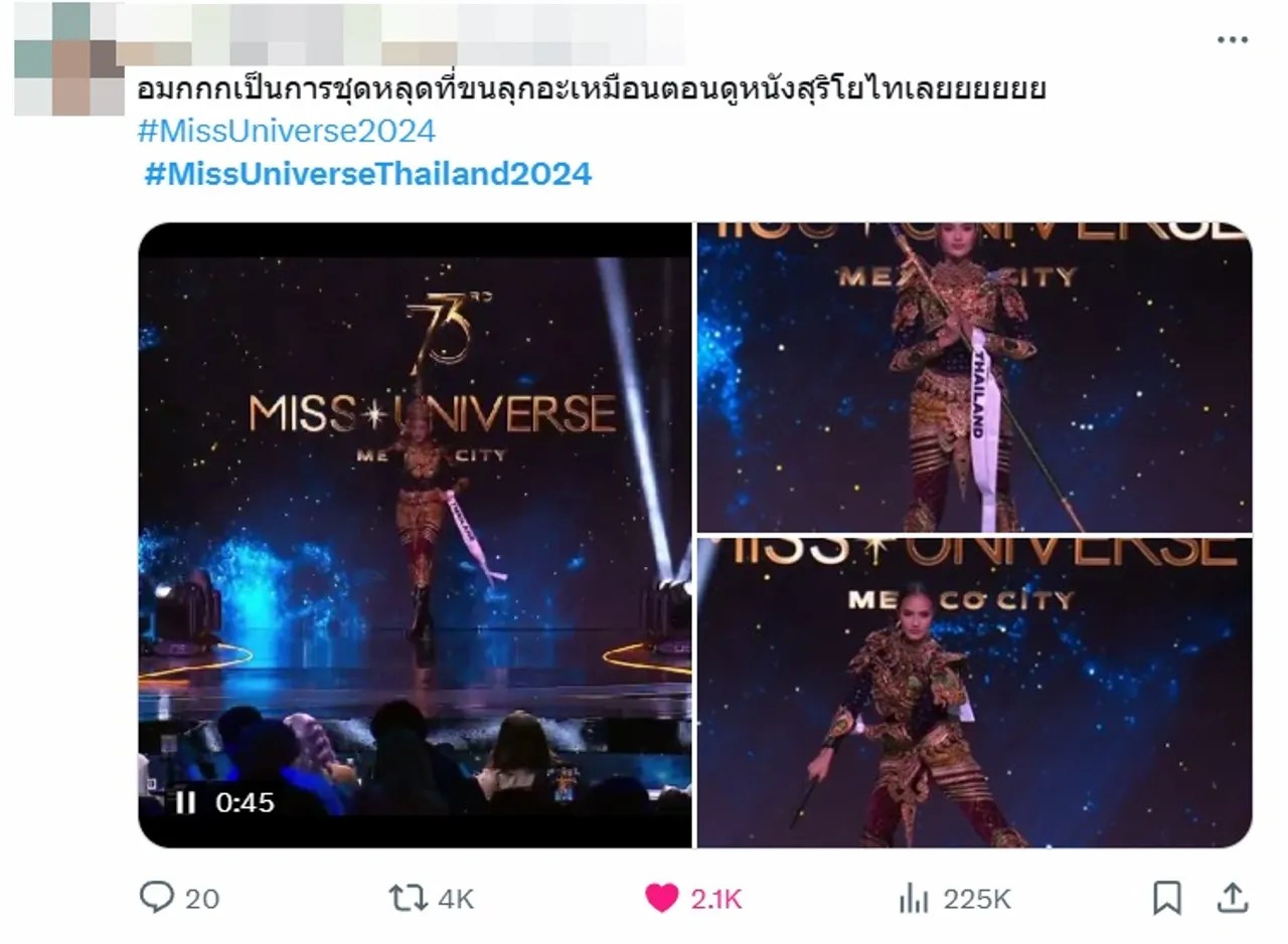 นอกจากนี้ ยังมีแฟนๆ นางงามที่ต่างแสดงความคิดเห็นผ่านทางทวิตเตอร์ (X) เกี่ยวกับประเด็นนี้ อาทิ อมกกกเป็นการชุดหลุดที่ขนลุกอะเหมือนตอนดูหนังสุริโยไทเลยยยยยย, เครื่องหัวตกในจังหวะที่ฟันพระแสงของ้าวลงมา นึกถึงเรื่องของพระสุริโยทัยตอนที่ถูกพระแสงของ้าวฟันจนสิ้นพระชนม์บนคอช้างเลย, แต่ต่างชาติ อาจจะมองว่ามันคือความผิดพลาด แต่คนไทย ที่รู้ประวัติท่าน มอง คือฟีลแบบสุริโยทัยจริงๆ สู้ออกรบ จนตัวตาย เครื่องหัวหลุด พม่าถึงรู้ว่าเป็นผู้หญิง ซึ่งตรงกับตอนที่โอปอ กำลังออกท่ารบ เครื่องหัวหลุด พอดี กูช็อตมากก เครื่องหัวหลุด หอกหลุด ฯลฯ