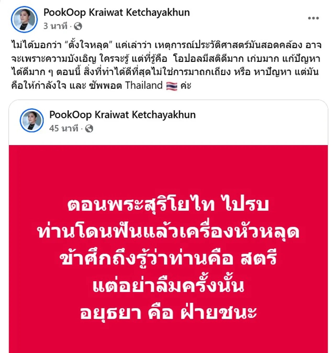 ก่อนที่จะแชร์โพสต์ดังกล่าวและเขียนข้อความชี้แจงเพิ่มเติมว่า “ไม่ได้บอกว่า “ตั้งใจหลุด” แค่เล่าว่า เหตุการณ์ประวัติศาสตร์มันสอดคล้อง อาจจะเพราะความบังเอิญ ใครจะรู้ แต่ที่รู้คือ โอปอลมีสติดีมาก เก่งมาก แก้ปัญหาได้ดีมากๆ ตอนนี้สิ่งที่ทำได้ดีที่สุดไม่ใช่การมาถกเถียงหรือหาปัญหา แต่มันคือให้กำลังใจและซัพพอร์ต Thailand ค่ะ”