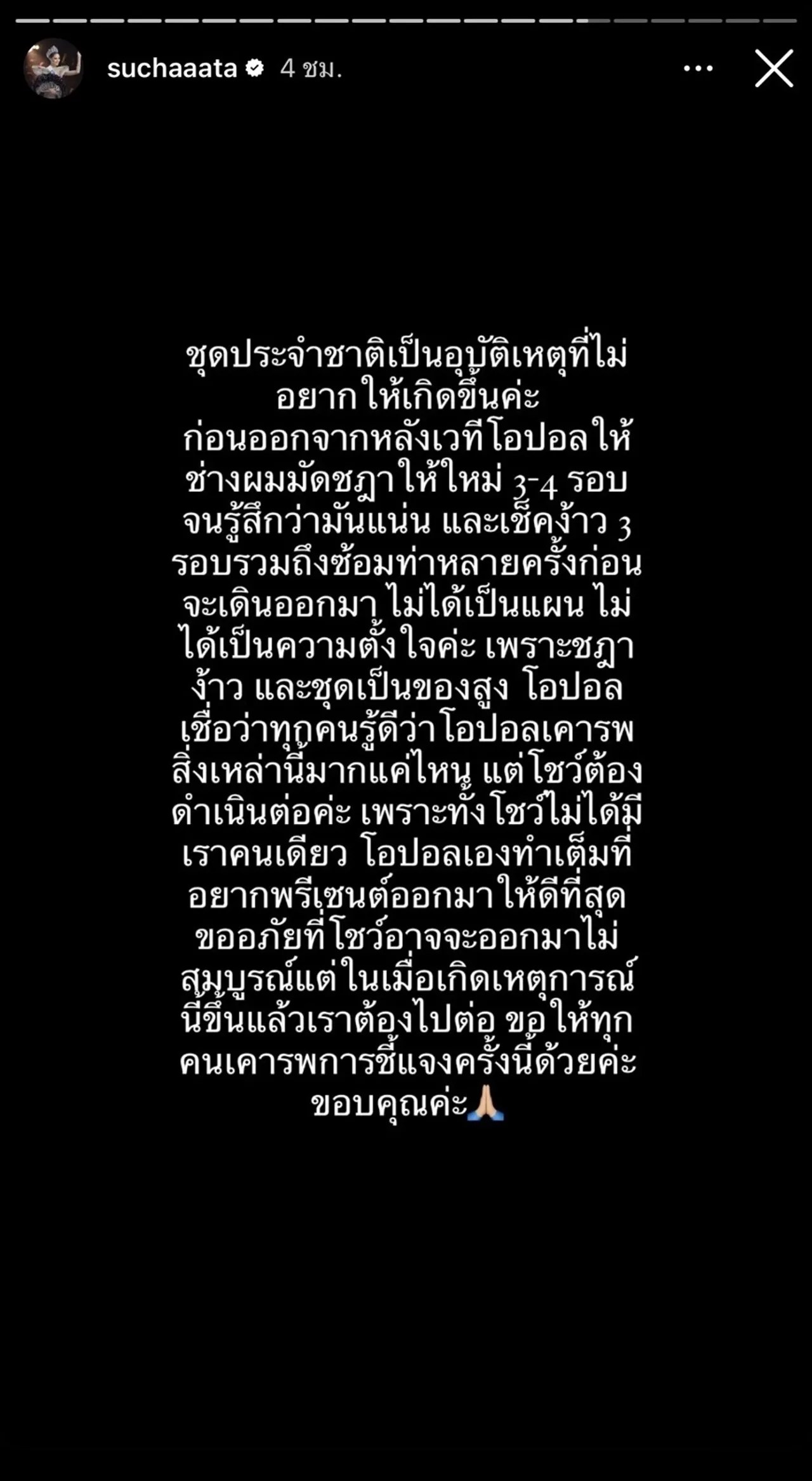 เพราะชฎา ง้าว และชุดเป็นของสูง โอปอลเชื่อว่าทุกคนรู้ดีว่าโอปอลเคารพสิ่งเหล่านี้มากแค่ไหน แต่โชว์ต้องดำเนินต่อค่ะ เพราะทั้งโชว์ไม่ได้มีเราคนเดียว โอปอลเองทำเต็มที่ อยากพรีเซนต์ออกมาให้ดีที่สุด ขออภัยที่โชว์อาจจะออกมาไม่สมบูรณ์ แต่ในเมื่อเกิดเหตุการณ์นี้ขึ้นแล้วเราต้องไปต่อ ขอให้ทุกคนเคารพการชี้แจงครั้งนี้ด้วยค่ะ ขอบคุณค่ะ” และใส่อีโมจิยกมือไหว้