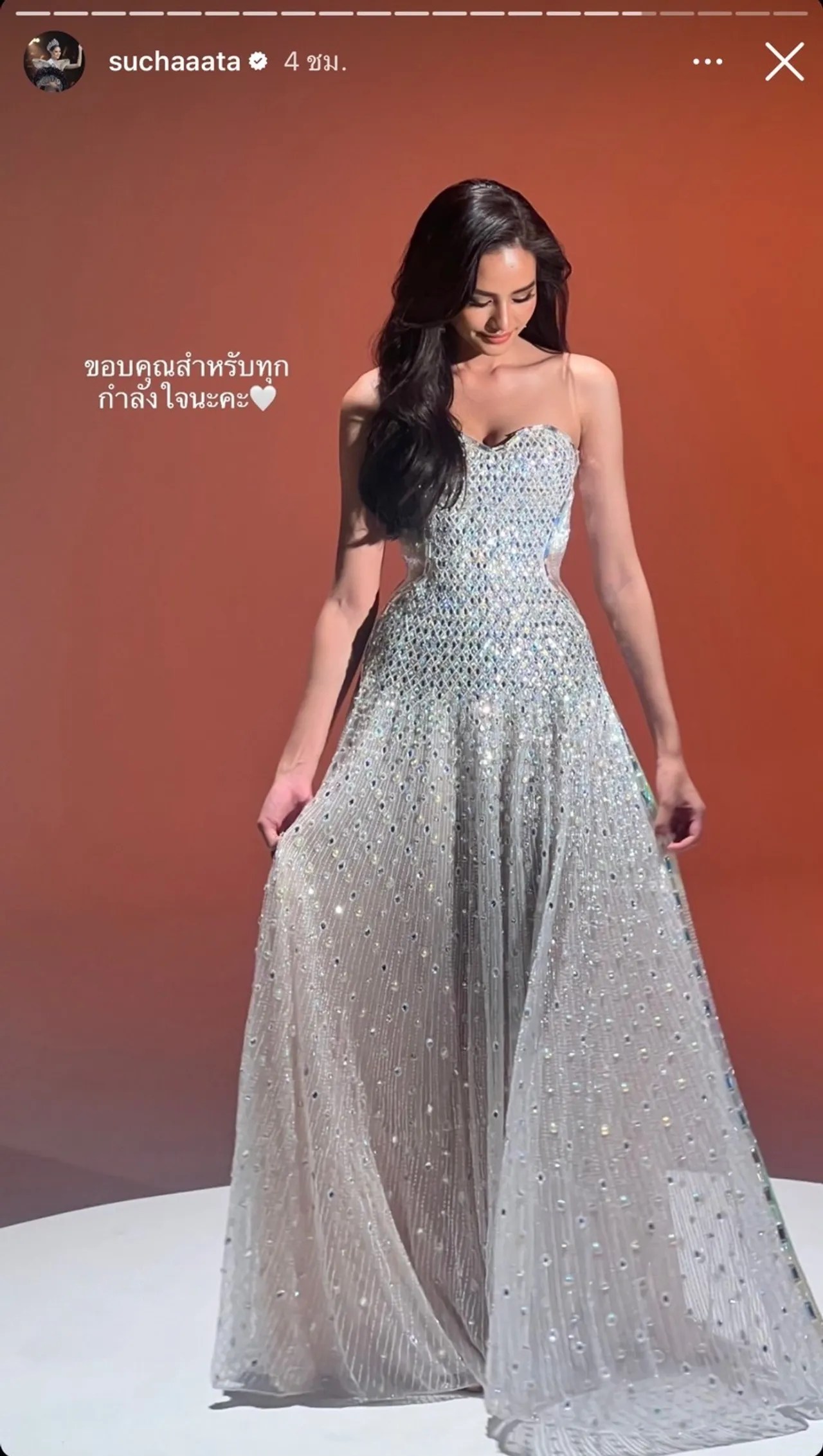 หลังจากนั้น โอปอล ก็ได้โพสต์ภาพตัวเองในชุดเดรสสีขาว พร้อมทั้งเขียนข้อความว่า “ขอบคุณสำหรับทุกกำลังใจนะคะ” และใส่อีโมจิหัวใจสีขาวด้วย