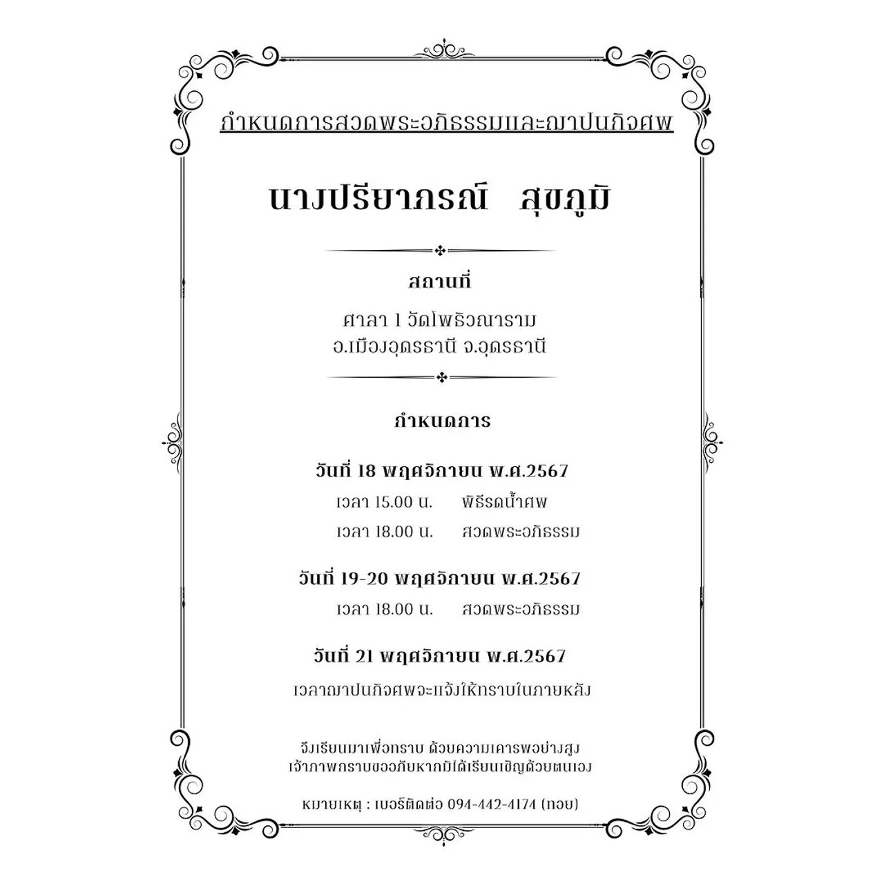 โดยสาวอุ้มได้โพสต์แจ้งข่าวเศร้านี้ในอินสตาแกรมส่วนตัว โดยระบุข้อความเอาไว้ว่า “ขออนุญาตแจ้งกำหนดการสวดพระอภิธรรมของคุณแม่อุ้มนะคะ” ซึ่งจะมีการสวดพระอภิธรรม และจะจัดที่ศาลา 1 วัดโพธิวณาราม อำเภอเมือง จังหวัดอุดรธานี ระหว่างวันที่ 18-21 พฤศจิกายน 2567 นี้