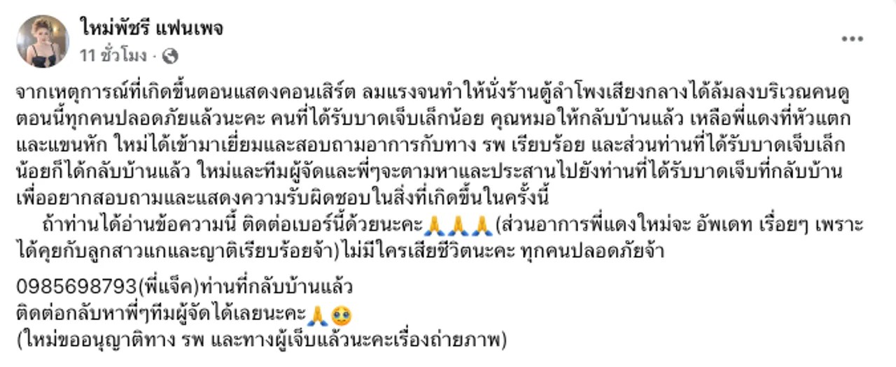 ใหม่ พัชรี พร้อมเยียวยาคนเจ็บจากอุบัติเหตุตู้ลำโพงล้มทับคนดู ยันไม่มีคนตาย