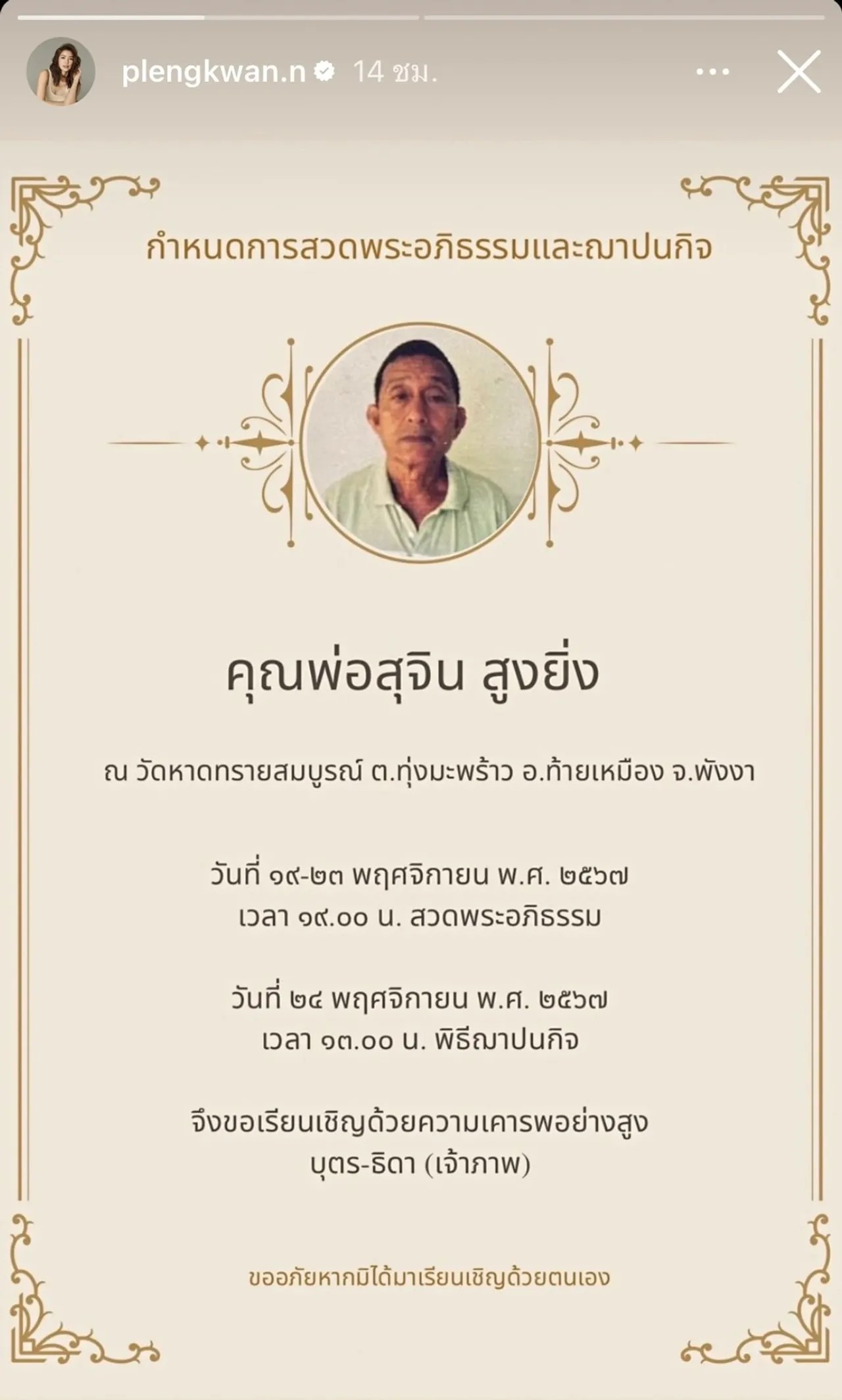และนอกจากนี้ เจ้าตัวยังได้แจ้งกำหนดการสวดพระอภิธรรมและฌาปนกิจของคุณพ่อเอาไว้ว่า จะจัดขึ้นที่วัดหาดทรายสมบูรณ์ ต.ทุ่งมะพร้าว อ.ท้ายเหมือง จ.พังงา ในวันที่ 19-23 พ.ย.2567 เวลา 19.00 น. สวดพระอภิธรรม วันที่ 24 พ.ย.2567 เวลา 13.00 น. พิธีฌาปนกิจ
