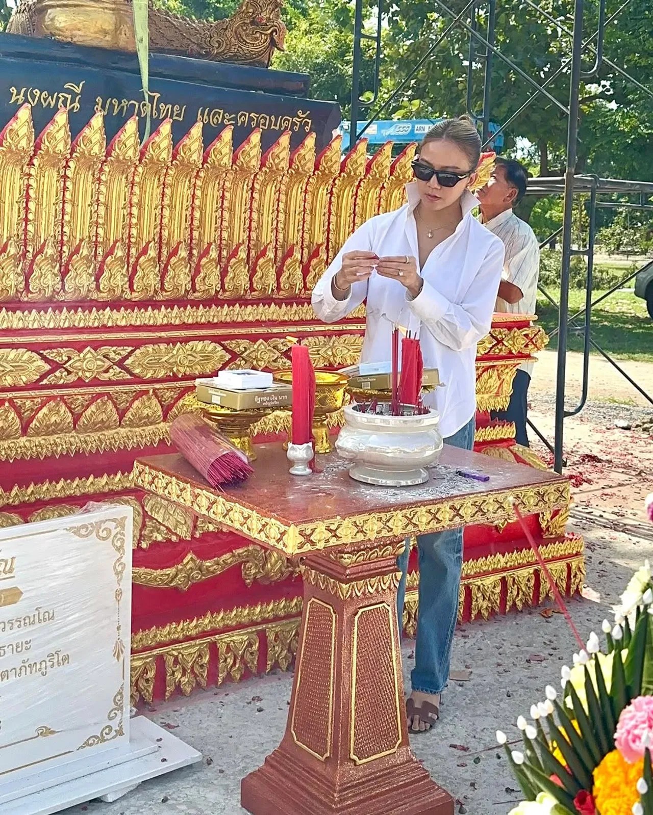 โดยจ๊ะได้โพสต์ภาพบรรยากาศที่ไปร่วมพิธีดังกล่าวพร้อมกับเขียนแคปชั่นว่า “เอาบุญมาฝากนะคะ .. จ๊ะสร้างท้าวเวสสุวรรณถวายวัดบ้านเพชร อ.แสวงหา จ.อ่างทอง บรรยากาศพิธีเบิกเนตร ใครเห็นโพสต์นี้ ขอพรปู่กันได้เลยน๊าาาาา”