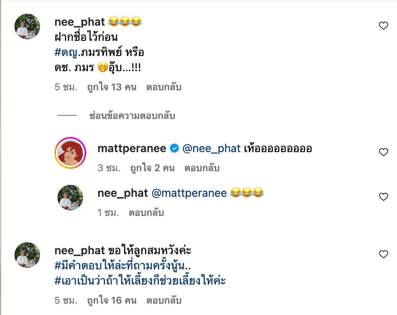 งานนี้คุณแม่ของสาวแมท ก็ได้เข้ามาคอมเมนต์รีบเสนอชื่อหลานทันที โดยคุณแม่ได้คอมเมนต์ว่า “ฝากชื่อไว้ก่อน ด.ญ.ภมรทิพย์ หรือ ด.ช. ภมร อุ๊บ!!” งานนี้ลูกสาวคนสวยก็ได้เข้ามาคอมเมนต์ตอบว่า “เห้อออออออออ”