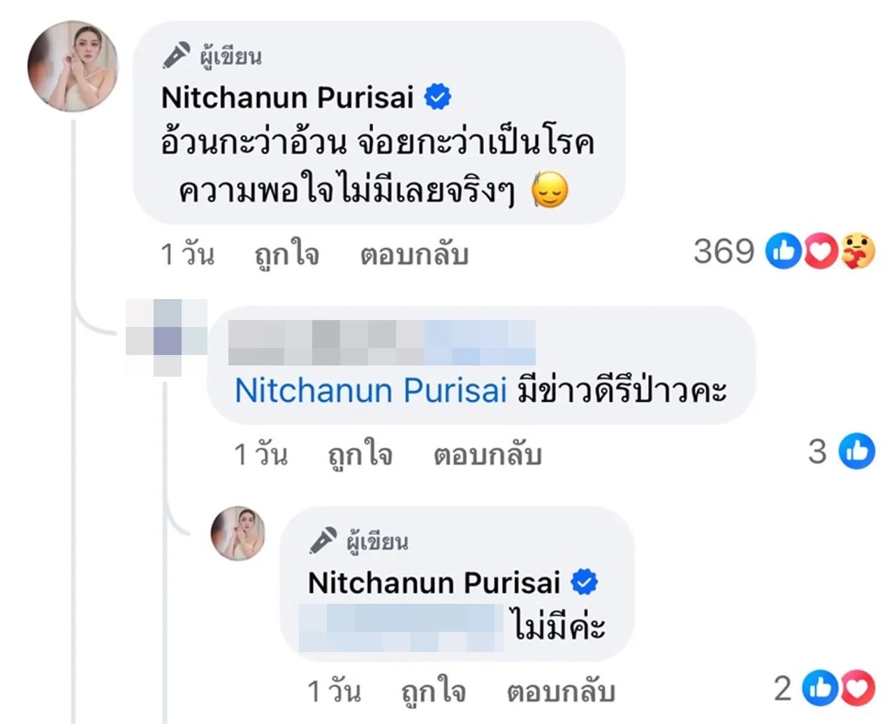 และเขียนในคอมเมนต์เพิ่มเติมว่า “จะอ้วนจะผอม มันรู้อยู่แหละ เพราะมันคือร่างกายของเรา เราเห็นมันทุกวัน อยู่กับมันทุกวัน เรารู้จักมันดีกว่าทุกคนด้วยซ้ำ .. แล้วไง อวบหรืออ้วน ร้องเพลงไม่ได้หรอ? หรือยังไง ???” และ “อ้วนกะว่าอ้วน จ่อยกะว่าเป็นโรค ความพอใจไม่มีเลยจริงๆ” โดยได้มีคนเข้ามาถาม แอน ว่า มีข่าวดีรึเปล่า ซึ่งเจ้าตัวก็ได้ตอบแบบเคลียร์ชัดเลยว่า “ไม่มีค่ะ”