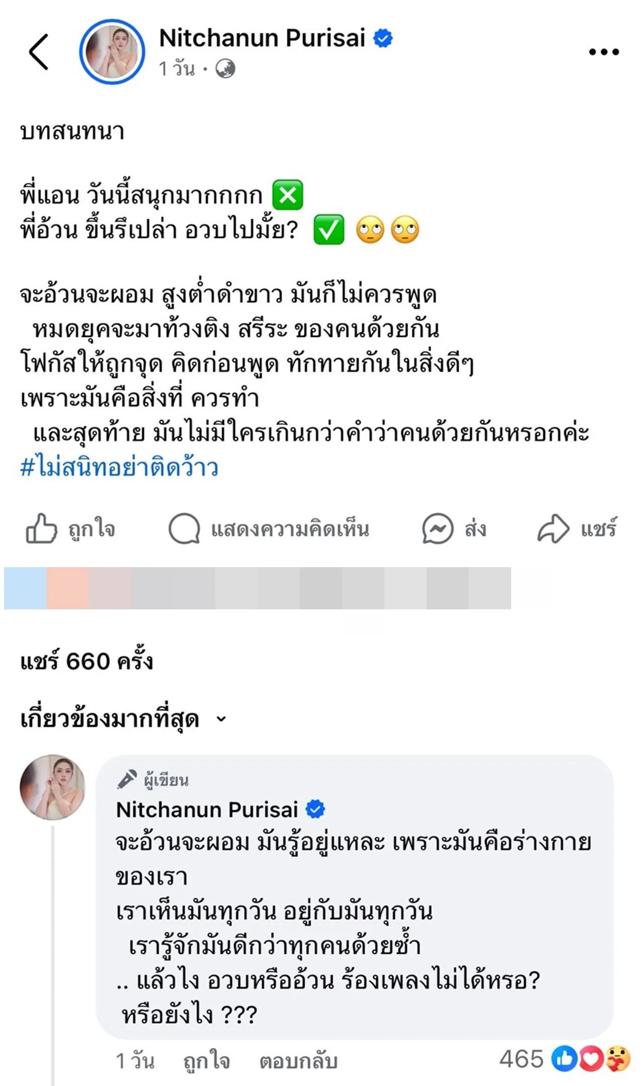 “บทสนทนา พี่แอน วันนี้สนุกมากกกก พี่อ้วนขึ้นรึเปล่า อวบไปมั้ย? จะอ้วนจะผอม สูงต่ำดำขาว มันก็ไม่ควรพูด หมดยุคจะมาท้วงติง สรีระ ของคนด้วยกัน โฟกัสให้ถูกจุด คิดก่อนพูด ทักทายกันในสิ่งดีๆ เพราะมันคือสิ่งที่ ควรทำ และสุดท้าย มันไม่มีใครเกินกว่าคำว่าคนด้วยกันหรอกค่ะ #ไม่สนิทอย่าติดว้าว”