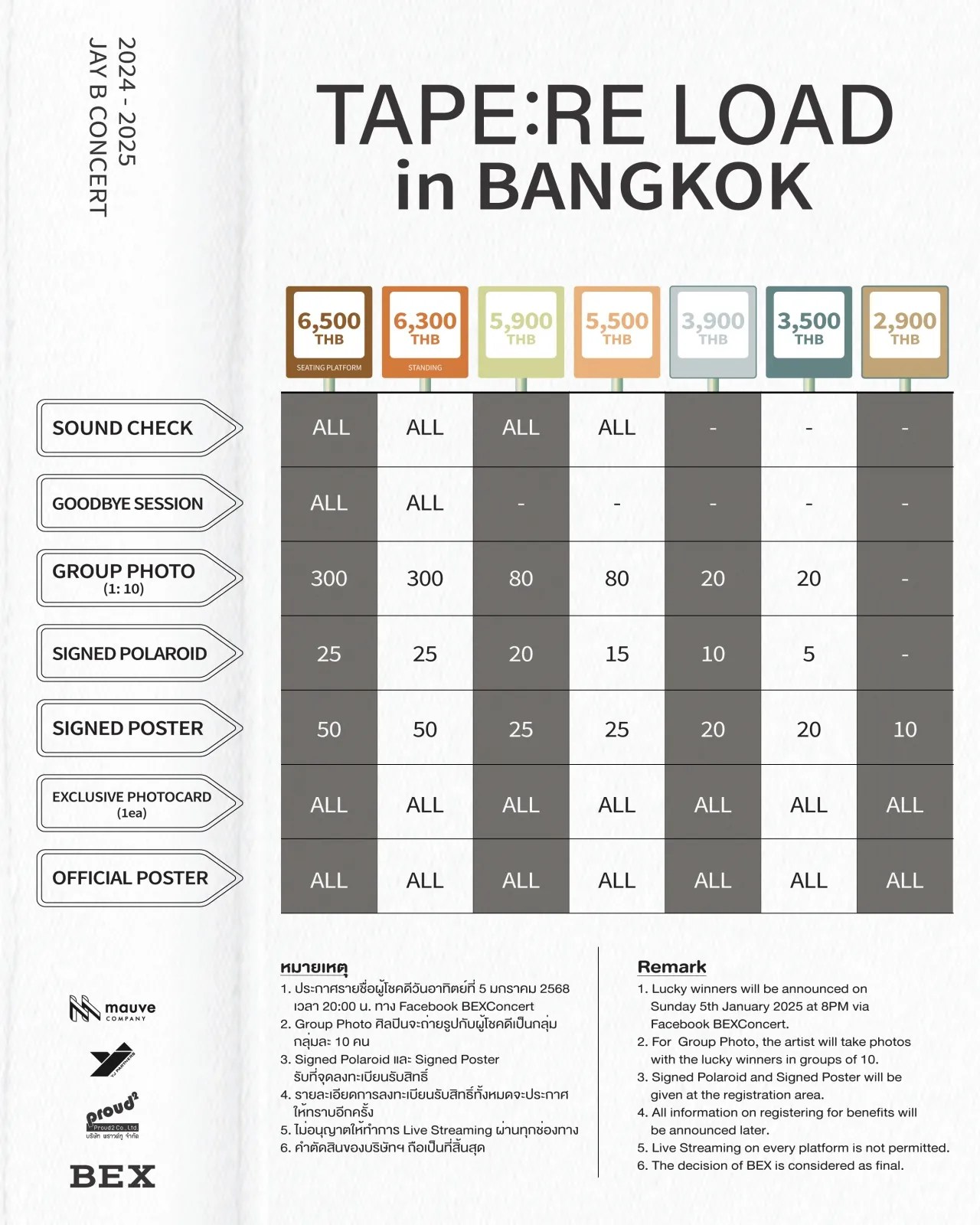 โดยงาน “2024-2025 JAY B CONCERT [TAPE: RE LOAD] IN BANGKOK” จะถูกจัดขึ้นในวันเสาร์ที่ 11 มกราคม 2568 และ วันอาทิตย์ที่ 12 มกราคม 2568 เวลา 18:00 น. ณ อิมแพ็ค อารีน่า เมืองทองธานี บัตรราคา 6,500 / 6,300 (บัตรยืน) / 5,900 / 5,500 / 3,900 / 3,500 และ 2,900 บาท และบัตรทุกที่นั่งจะได้รับบัตรแข็งที่ระลึก / EXCLUSIVE PHOTOCARD (1EA) และ OFFICIAL POSTER อีกด้วย