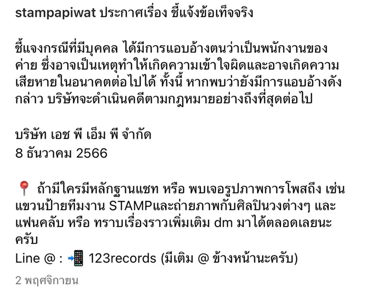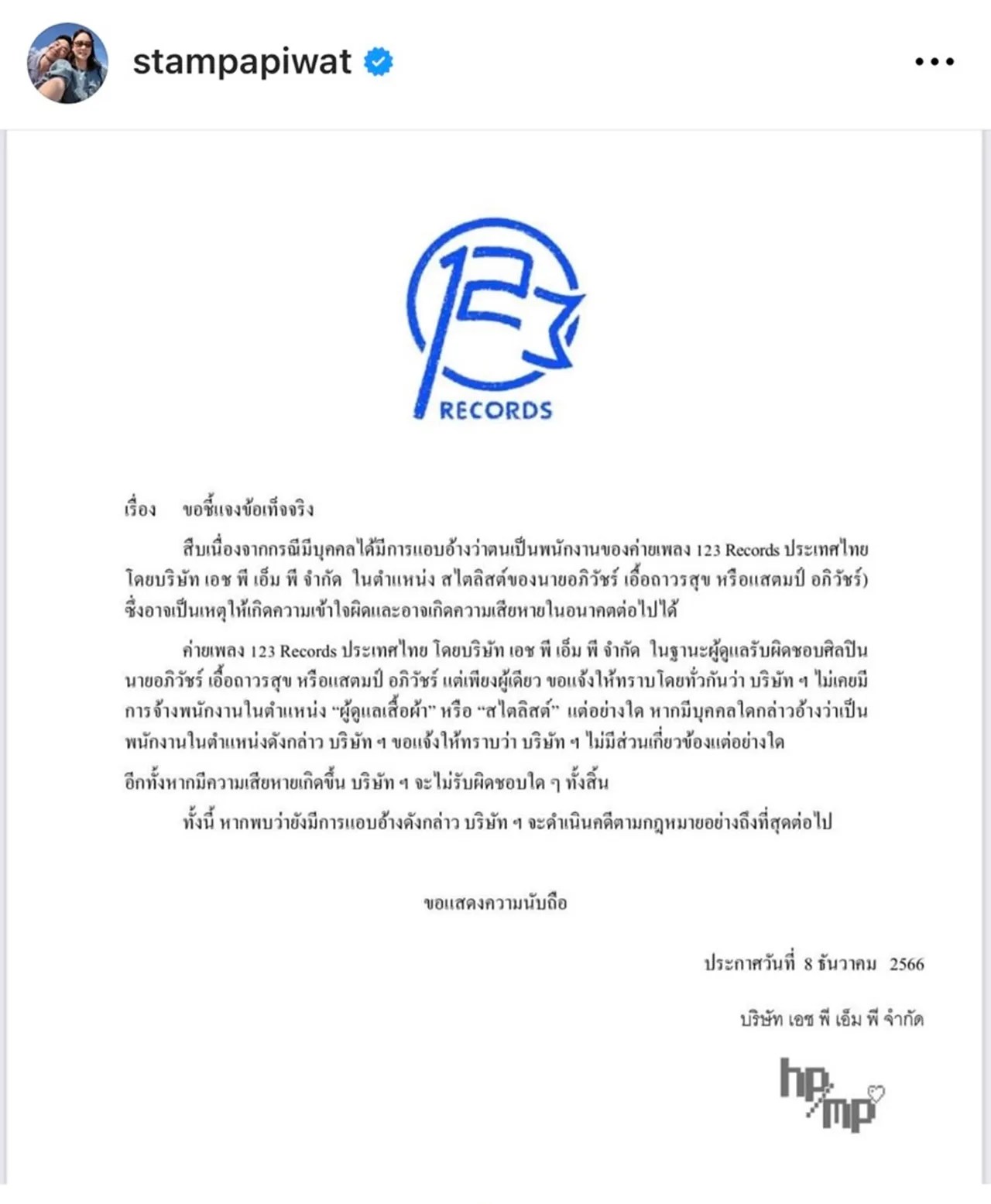และก่อนหน้านี้ แสตมป์ ก็ได้โพสต์จดหมายจากบริษัทของตัวเอง เผยว่า เนื่องจากได้มีคนแอบอ้างว่าเป็นสไตลิสต์ของแสตมป์ ขอแจ้งให้ทราบว่า ทางบริษัทไม่เคยได้ว่าจ้างคนในตำแหน่งสไตลิสต์แต่อย่างใด หากมีใครแอบอ้างทางบริษัทไม่มีส่วนเกี่ยวข้องแต่อย่างใด และถ้ายังมีการแอบอ้างอีก จะดำเนินการทางกฎหมายอย่างถึงที่สุด พร้อมลงวันที่ 8 ธันวาคม 2566