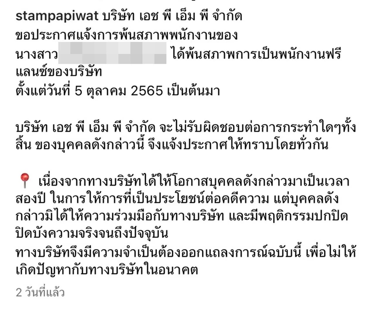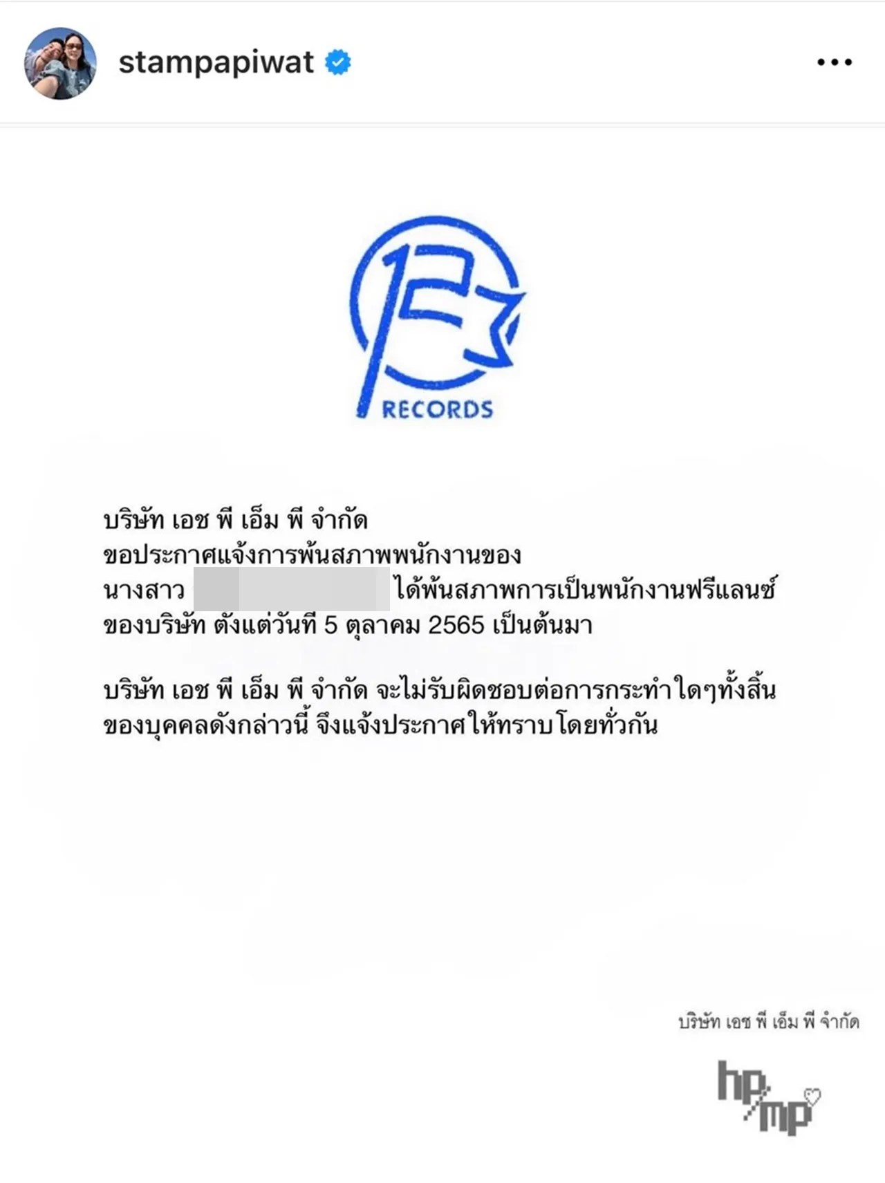 จากนั้นในอินสตาแกรมของ แสตมป์ ก็ได้โพสต์ประกาศอย่างเป็นทางการ พร้อมกับแจ้งชื่อของพนักงานฟรีแลนซ์คนหนึ่งของบริษัท ที่ได้พ้นสภาพพนักงานแล้วตั้งแต่วันที่ 5 ตุลาคม 2565 เป็นต้นมา หากเกิดอะไรขึ้น บริษัทของตนเองจะไม่รับผิดชอบใดๆ ทั้งสิ้น