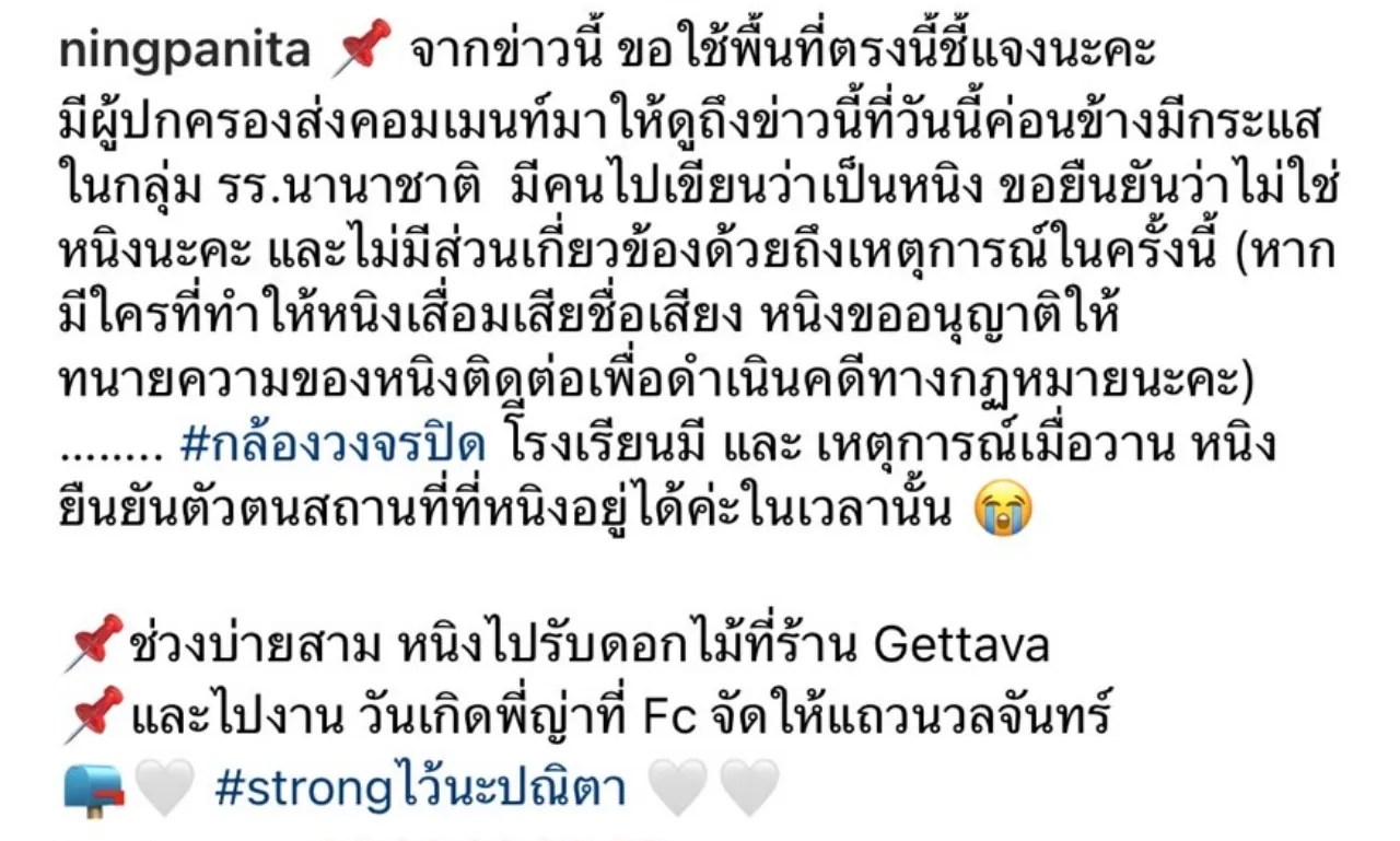 “จากข่าวนี้ ขอใช้พื้นที่ตรงนี้ชี้แจงนะคะ มีผู้ปกครองส่งคอมเมนต์มาให้ดูถึงข่าวนี้ที่วันนี้ค่อนข้างมีกระแสในกลุ่มโรงเรียนนานาชาติ มีคนไปเขียนว่าเป็นหนิง ขอยืนยันว่าไม่ใช่หนิงนะคะ และไม่มีส่วนเกี่ยวข้องด้วยถึงเหตุการณ์ในครั้งนี้ (หากมีใครที่ทำให้หนิงเสื่อมเสียชื่อเสียง หนิงขออนุญาตให้ทนายความของหนิงติดต่อเพื่อดำเนินคดีทางกฎหมายนะคะ) …….. #กล้องวงจรปิด โรงเรียนมี และเหตุการณ์เมื่อวาน หนิงยืนยันตัวตนสถานที่ที่หนิงอยู่ได้ค่ะในเวลานั้น