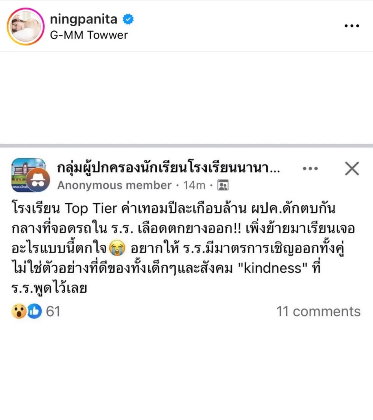 อยู่ดีๆ ก็ถูกกล่าวหาซะงั้น สำหรับ หนิง ปณิตา หลังมีคนได้มาโพสต์ข้อความผ่านโซเชียล บอกว่า “โรงเรียน Top Tier ค่าเทอมปีละเกือบล้าน ผู้ปกครองดักตบกันกลางที่จอดรถในโรงเรียน เลือดตกยางออก!! เพิ่งย้ายมาเรียนเจออะไรแบบนี้ตกใจ อยากให้โรงเรียนมีมาตรการเชิญออกทั้งคู่ ไม่ใช่ตัวอย่างที่ดีของทั้งเด็กๆ และสังคม kindness ที่โรงเรียนพูดไว้เลย”