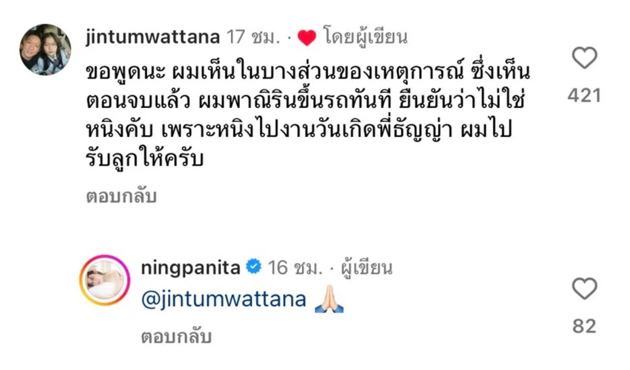 จากเรื่องนี้ อดีตสามี จิน จรินทร์ ก็ได้เข้ามาคอมเมนต์ช่วยยืนยันอีกเสียงว่า ไม่ใช่อดีตภรรยาแน่นอน เพราะอยู่ในเหตุการณ์ และหนิงไปงานวันเกิดของพี่ธัญญ่าจริงๆ