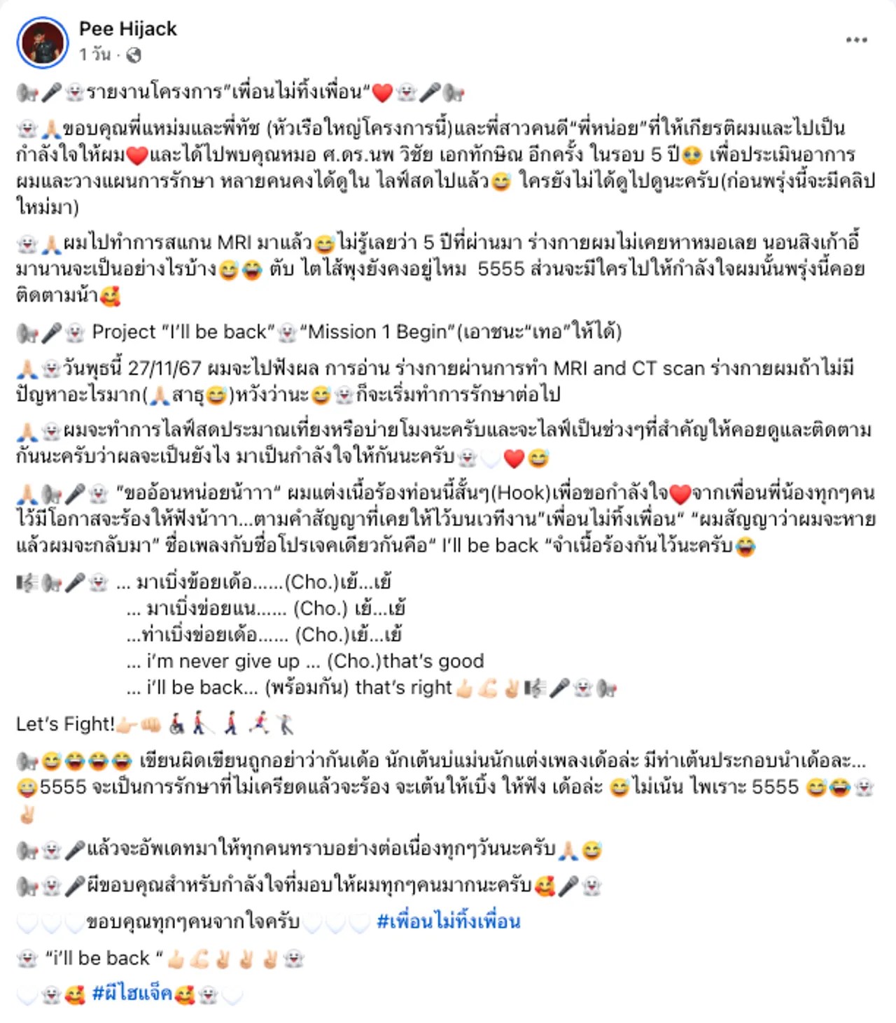 แล้วจะอัปเดตมาให้ทุกคนทราบอย่างต่อเนื่องทุกๆ วันนะครับ ผีขอบคุณสำหรับกำลังใจที่มอบให้ผมทุกๆ คนมากนะครับ ขอบคุณทุกๆ คนจากใจครับ #เพื่อนไม่ทิ้งเพื่อน “i’ll be back” #ผีไฮแจ็ค”