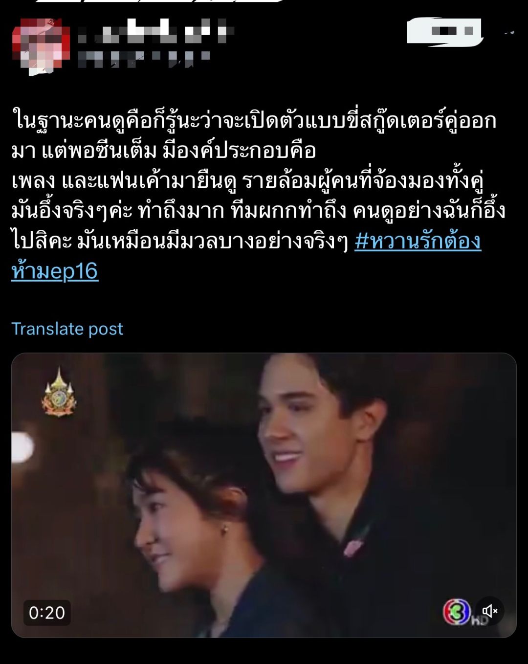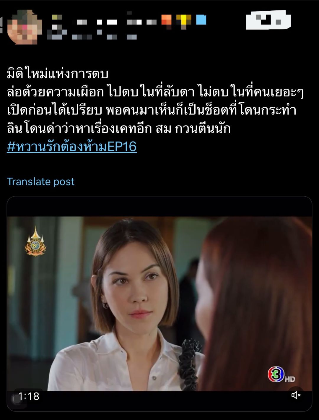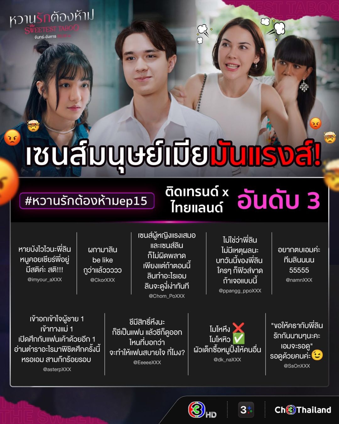 สร้างความร้าวฉานสนั่นจอกันเลยทีเดียว สำหรับละคร เรื่อง “หวานรักต้องห้าม” ทางช่อง 3 กับการเปิดตัวสาว เอม (เจนนิษฐ์ โอ่ประเสริฐ)ที่คธา (ไมกี้ ปณิธาน)สนิทสนมกับเพื่อนสาวคนนี้เกินหน้าเกินตาจนสร้างเรื่องทำ ลิน (แมท ภีรนีย์) ปรี๊ดแตก! เซนส์มนุษย์เมียทำงานแรงบุกฉะต่อหน้า จนแฟนละครแบ่งทีม #ทีมลิน #ทีมเอมจนพาแฮชแท็ก #หวานรักต้องห้ามEP15 ติดเทรนด์ X ประเทศไทยอันดับ 3