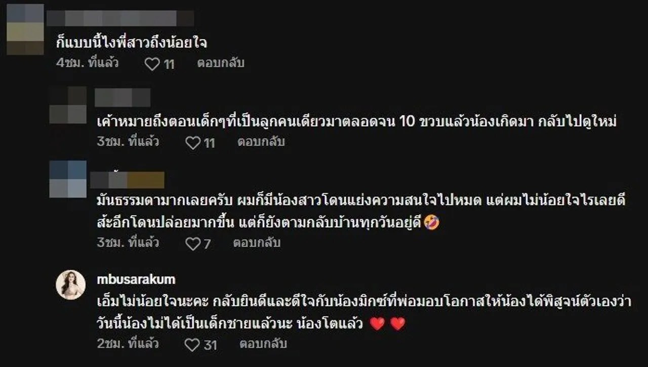 แต่มี่ชาวเน็ตรายหนึ่งเข้ามาแสดงคอมเมนต์แสดงความคิดเห็นว่า “ก็แบบนี้ไงพี่สาวถึงน้อยใจ” งานนี้ เอ็ม บุษราคัม ลูกสาวคนโตของ หม่ำ จ๊กมก ไม่ทน เข้ามาตอบคอมเมนต์ดังกล่าวว่า “เอ็มไม่น้อยใจนะคะ กลับยินดีและดีใจกับน้องมิกซ์ที่พ่อมอบโอกาสให้น้องได้พิสูจน์ตัวเองว่าวันนี้น้องไม่ได้เป็นเด็กชายแล้วนะ น้องโตแล้ว”