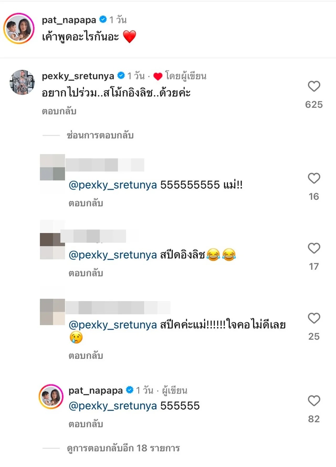 พอโพสต์คลิปไปก็มี เป็กกี้ ศรีธัญญา เข้ามาคอมเมนต์แซวว่า “อยากไปร่วม..สโม้กอิงลิช..ด้วยค่ะ” ทำเอาแฟนๆ แห่คอมเมนต์สนั่น อาทิ สปีคค่ะแม่!!!!!! ใจคอไม่ดีเลย, แม๊…กลับมาแก้ก่อนค่ะ ใจคอไม่ดีแล้ววว, สปีคอิงลิชมั้ยคะ พี่เป็กกี้ ฯลฯ