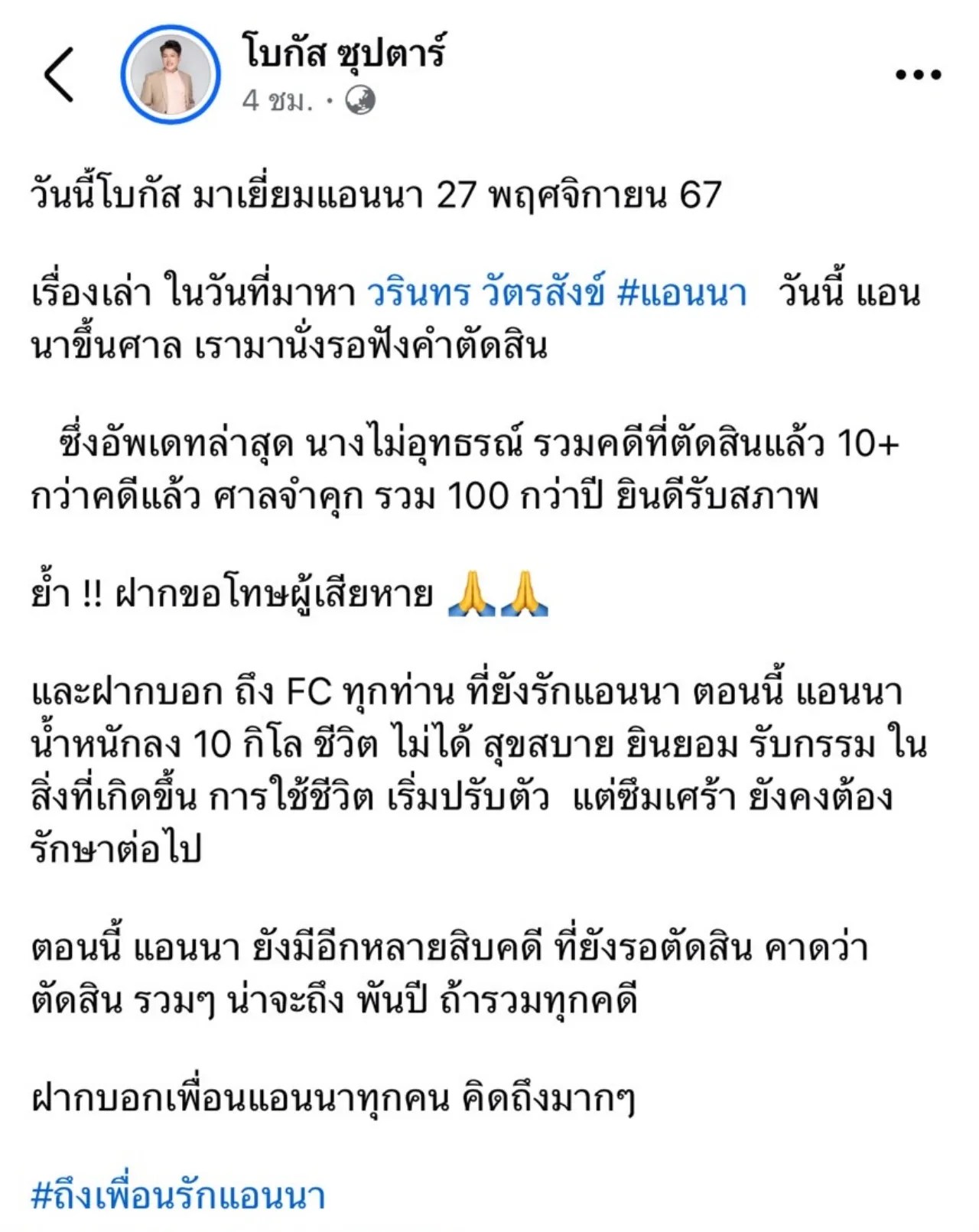 ตอนนี้ แอนนา ยังมีอีกหลายสิบคดี ที่ยังรอตัดสิน คาดว่า ตัดสิน รวมๆ น่าจะถึง พันปี ถ้ารวมทุกคดี ฝากบอกเพื่อนแอนนาทุกคน คิดถึงมากๆ #ถึงเพื่อนรักแอนนา”