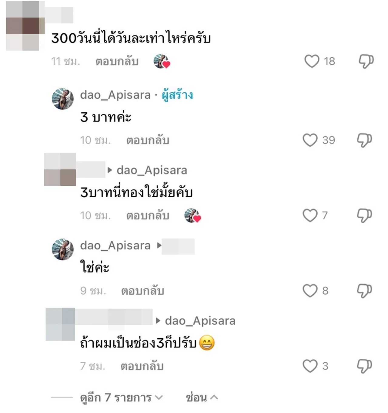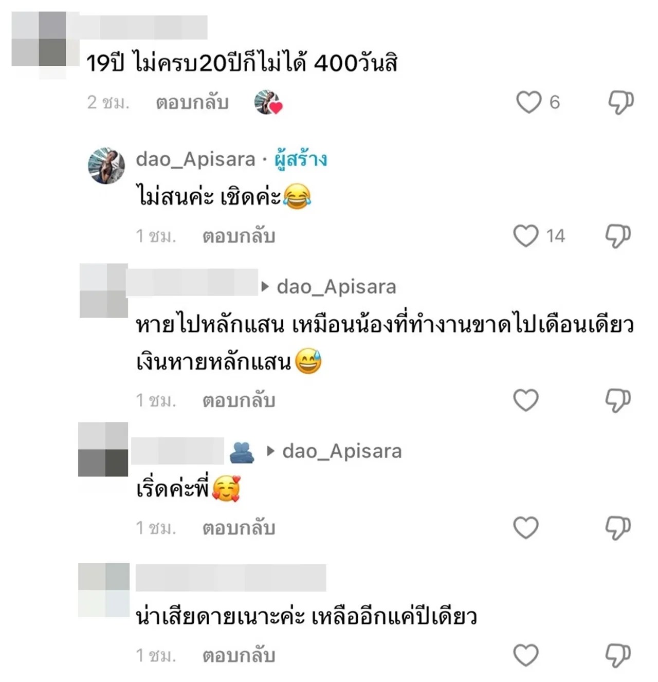 และเมื่อมีคนเข้ามาสอบถามว่าจ้างออกและได้เงินชดเชย 300 วัน เป็นเงินเท่าไร ดาว อภิสรา ก็ตอบขำๆ ว่า “3 บาทค่ะ” พอคนถามอีกว่า 3 บาทนี่ทองใช่มั้ย เจ้าตัวก็บอกว่าใช่ และเมื่อมีคนแสดงความคิดเห็นว่า “19 ปี ไม่ครบ 20 ปีก็ไม่ได้ 400 วันสิ” ดาว อภิสรา ก็บอกว่า “ไม่สนค่ะ เชิดค่ะ”