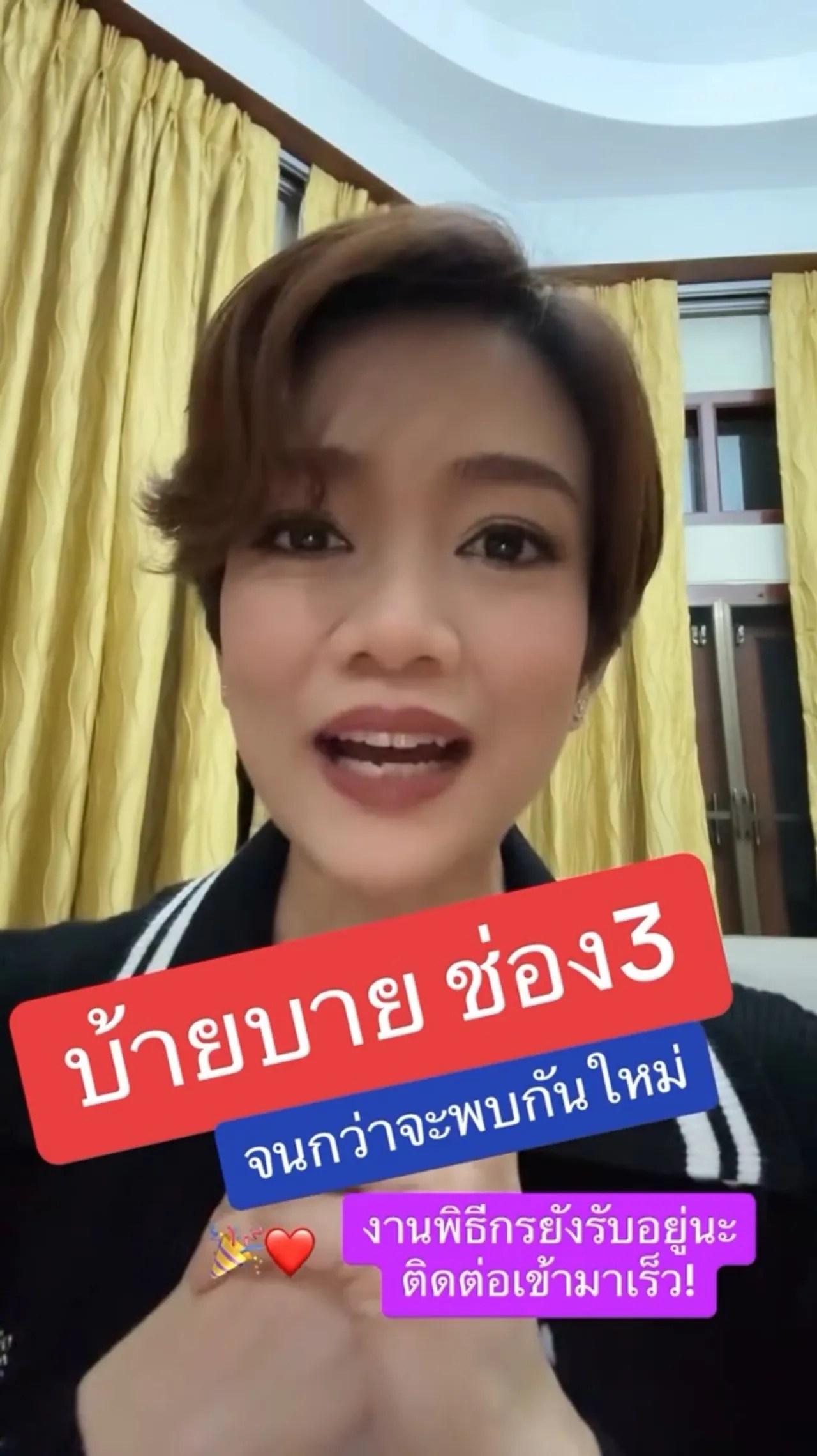 ส่วนใครสนใจอยากจะร่วมงานกับดาว ก็ติดต่อเข้ามาได้เลยนะ ทุกที่ ตอนนี้ว่างอยู่นะคะ เปิดโอกาสให้จีบได้นะคะ ไม่เป็นไรนะคะทุกคน ไม่ต้องให้กำลังใจ จริงๆ เป็นความสมัครใจของตัวเองด้วยนะคะ ก็ต้องขอบคุณช่อง 3 ด้วย อย่าลืมติดตามนะคะ ช่อง 3 ก็ยังคงอยู่ต่อไป อยู่เป็นเพื่อนของคุณผู้ชมทุกคนด้วยนะคะ”