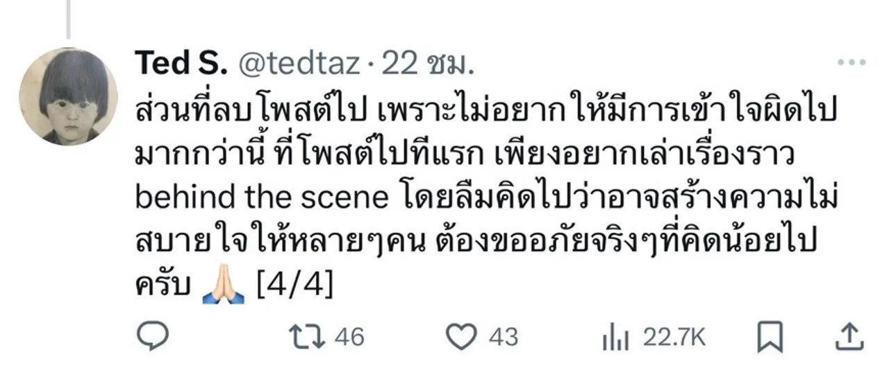 ส่วนที่ลบโพสต์ไป เพราะไม่อยากให้มีการเข้าใจผิดไปมากกว่านี้ ทีโพสต์ไปทีแรก เพียงอยากเล่าเรื่องราว behind the scene โดยลืมคิดไปว่าอาจสร้างความไม่สบายใจให้หลายๆ คน ต้องขออภัยจริงๆ ที่คิดน้อยไปครับ”