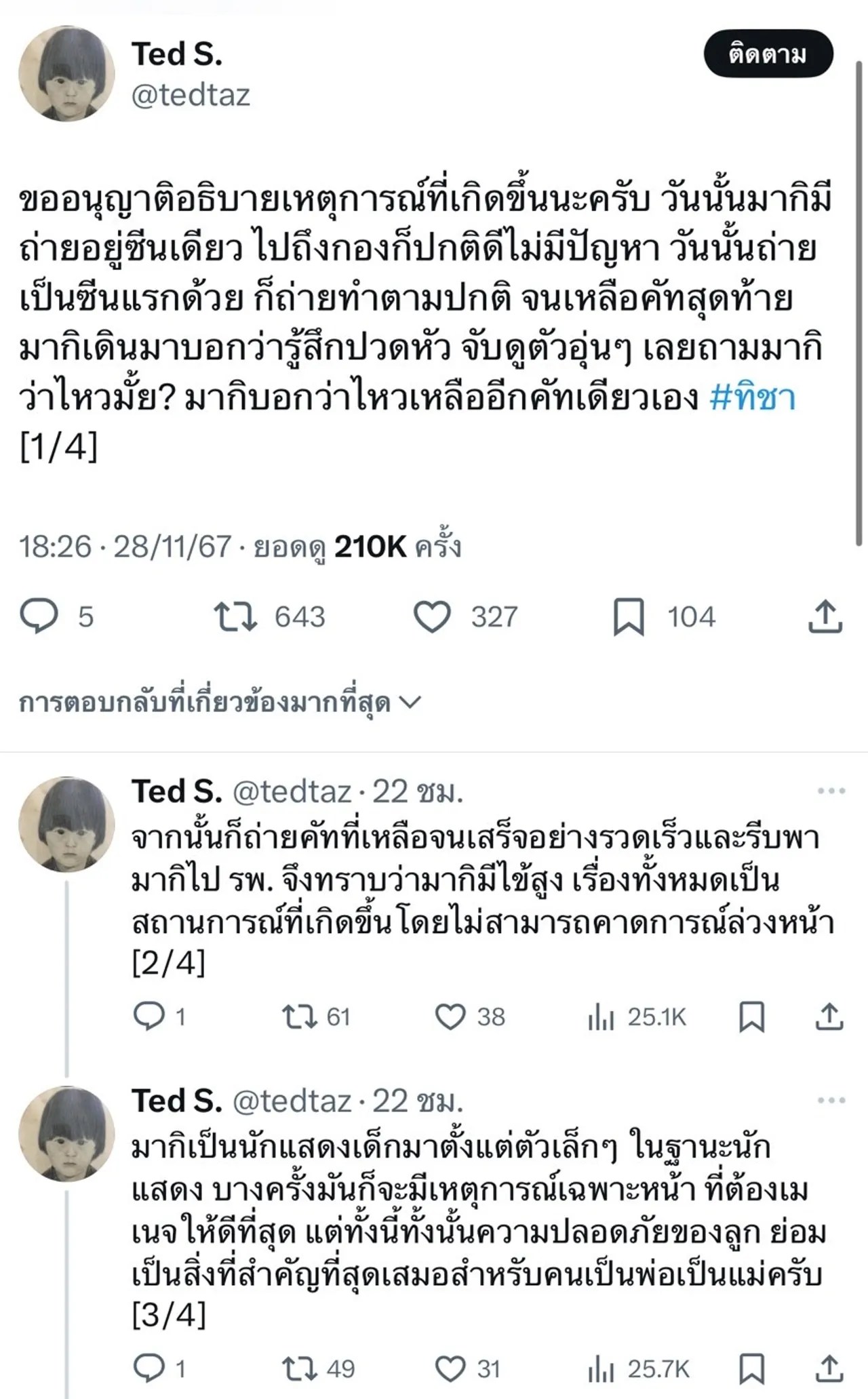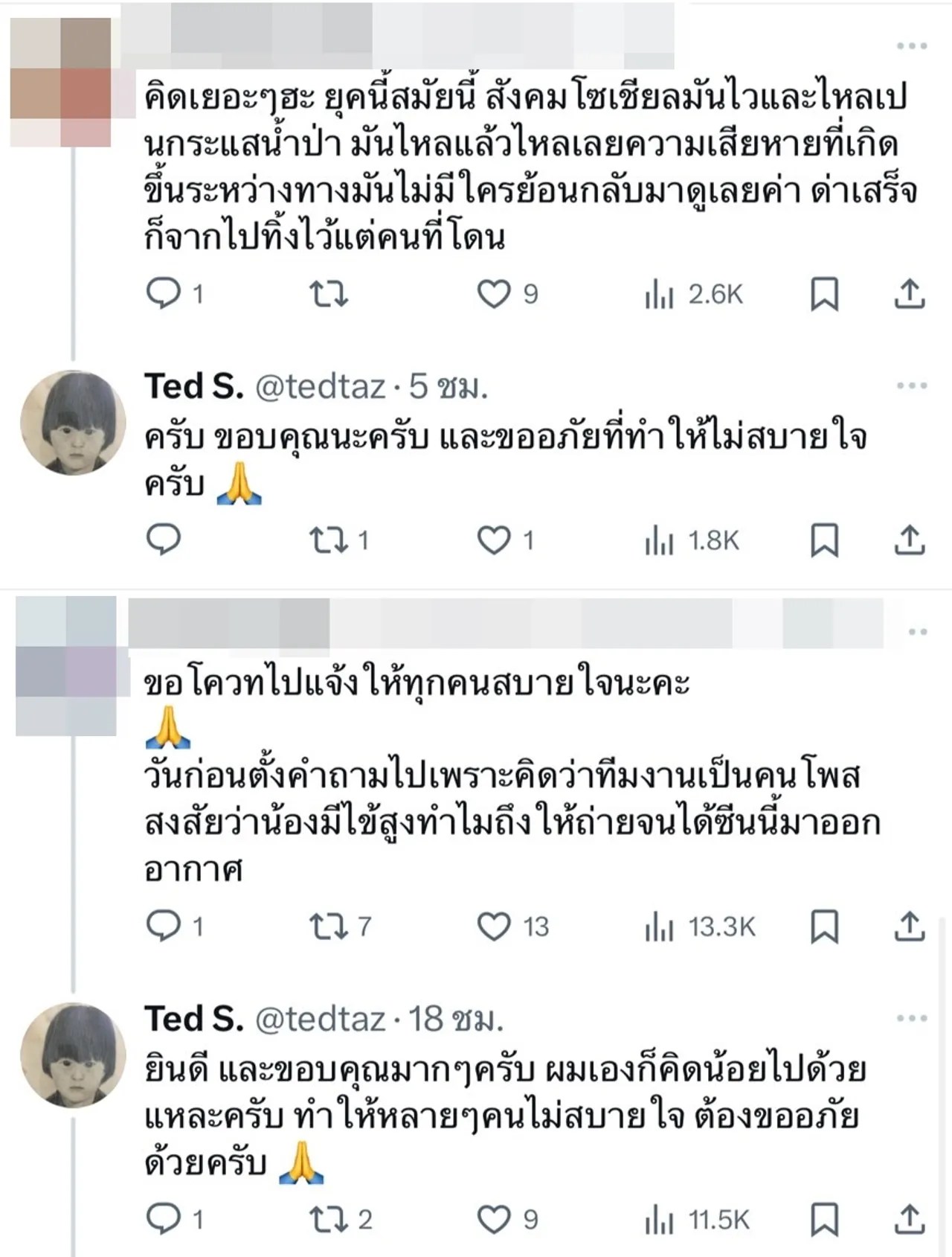 หลังจากนั้นก็มีคนเข้ามาแสดงความคิดเห็นมากมาย โดยมีผู้ใช้ทวิตเตอร์ (X) คนหนึ่งบอกว่า “ขอโควทไปแจ้งให้ทุกคนสบายใจนะคะ วันก่อนตั้งคำถามไปเพราะคิดว่าทีมงานเป็นคนโพสต์ สงสัยว่าน้องมีไข้สูงทำไมถึงให้ถ่ายจนได้ชีนนี้มาออกอากาศ” จากนั้นคุณพ่อก็ตอบว่า “ยินดี และขอบคุณมากๆ ครับ ผมเองก็คิดน้อยไปด้วย แหละครับ ทำให้หลายๆ คนไม่สบายใจ ต้องขออภัยด้วยครับ”