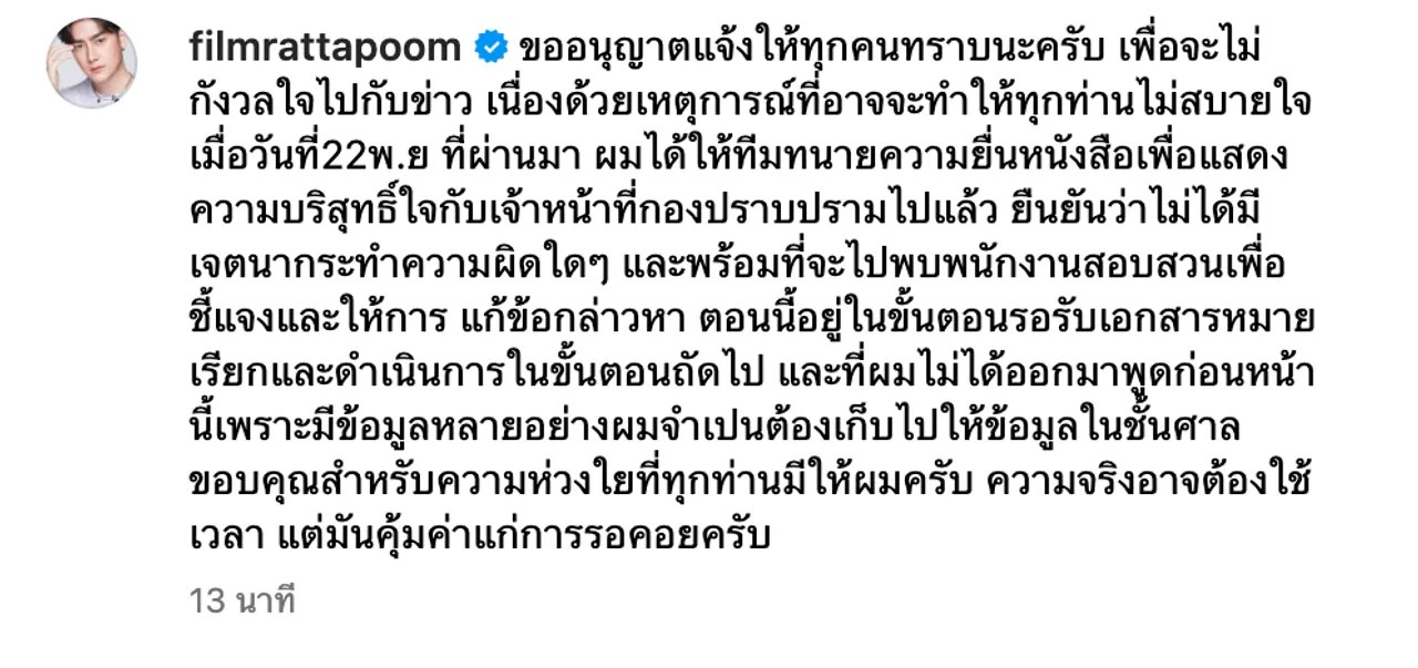 “ขออนุญาตแจ้งให้ทุกคนทราบนะครับ เพื่อจะไม่กังวลใจไปกับข่าว เนื่องด้วยเหตุการณ์ที่อาจจะทำให้ทุกท่านไม่สบายใจ เมื่อวันที่ 22 พ.ย. ที่ผ่านมา ผมได้ให้ทีมทนายความยื่นหนังสือเพื่อแสดงความบริสุทธิ์ใจกับเจ้าหน้าที่กองปราบปรามไปแล้ว ยืนยันว่าไม่ได้มีเจตนากระทำความผิดใดๆ และพร้อมที่จะไปพบพนักงานสอบสวนเพื่อชี้แจงและให้การแก้ข้อกล่าวหา