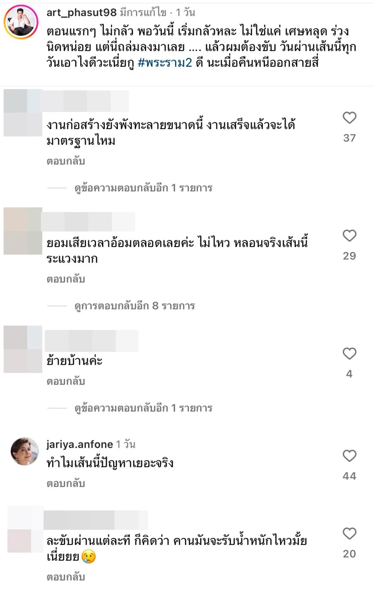 ด้านนักแสดง-ผู้จัดละครสาว นก จริยา แอนโฟเน่ ก็แสดงความคิดเห็นว่า “ทำไมเส้นนี้ปัญหาเยอะจริง” และในคอมเมนต์ก็มีแฟนๆ เข้ามาแสดงความคิดเห็นมากมาย อาทิ งานก่อสร้างยังพังทลายขนาดนี้ งานเสร็จแล้วจะได้มาตรฐานไหม, ยอมเสียเวลาอ้อมตลอดเลยค่ะ ไม่ไหว หลอนจริงเส้นนี้ ระแวงมาก, ละขับผ่านแต่ละที ก็คิดว่าคานมันจะรับน้ำหนักไหวมั้ยเนี่ยยย, คนสมุทรสาคร ต้องใช้เส้นนี้ทุกวันจริงๆ ครับ กลัวทุกวัน ฯลฯ