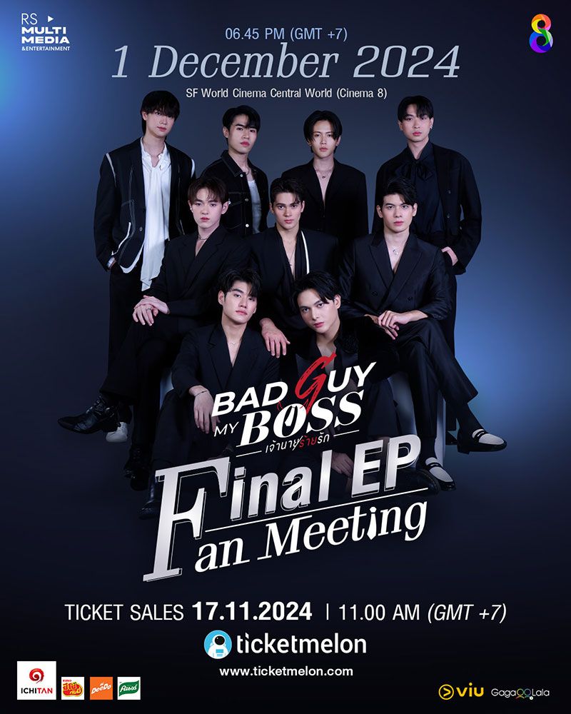 สำหรับใครที่มีบัตรแล้ว เตรียมความพร้อม ฟิตร่างกายของคุณเอาไว้ แล้วมาตะโกนความฟิน กวาดทุกโมเมนต์ความจอย พร้อมกันได้ที่งาน “Bad Guy My Boss Final EP. Fan Meeting”ในวันอาทิตย์ที่ 1 ธันวาคมนี้ ณ เอส เอฟ เวิลด์ ซีเนม่า เซ็นทรัลเวิลด์ โรงภาพยนตร์ 8 สามารถติดตามรับชมซีรีส์ Bad Guy My Boss เจ้านายร้ายรัก ย้อนหลังได้ที่ Viu / inter-national fandom รับชมผ่าน GagaOOLala #BadGuyMyBoss #เจ้านายร้ายรัก