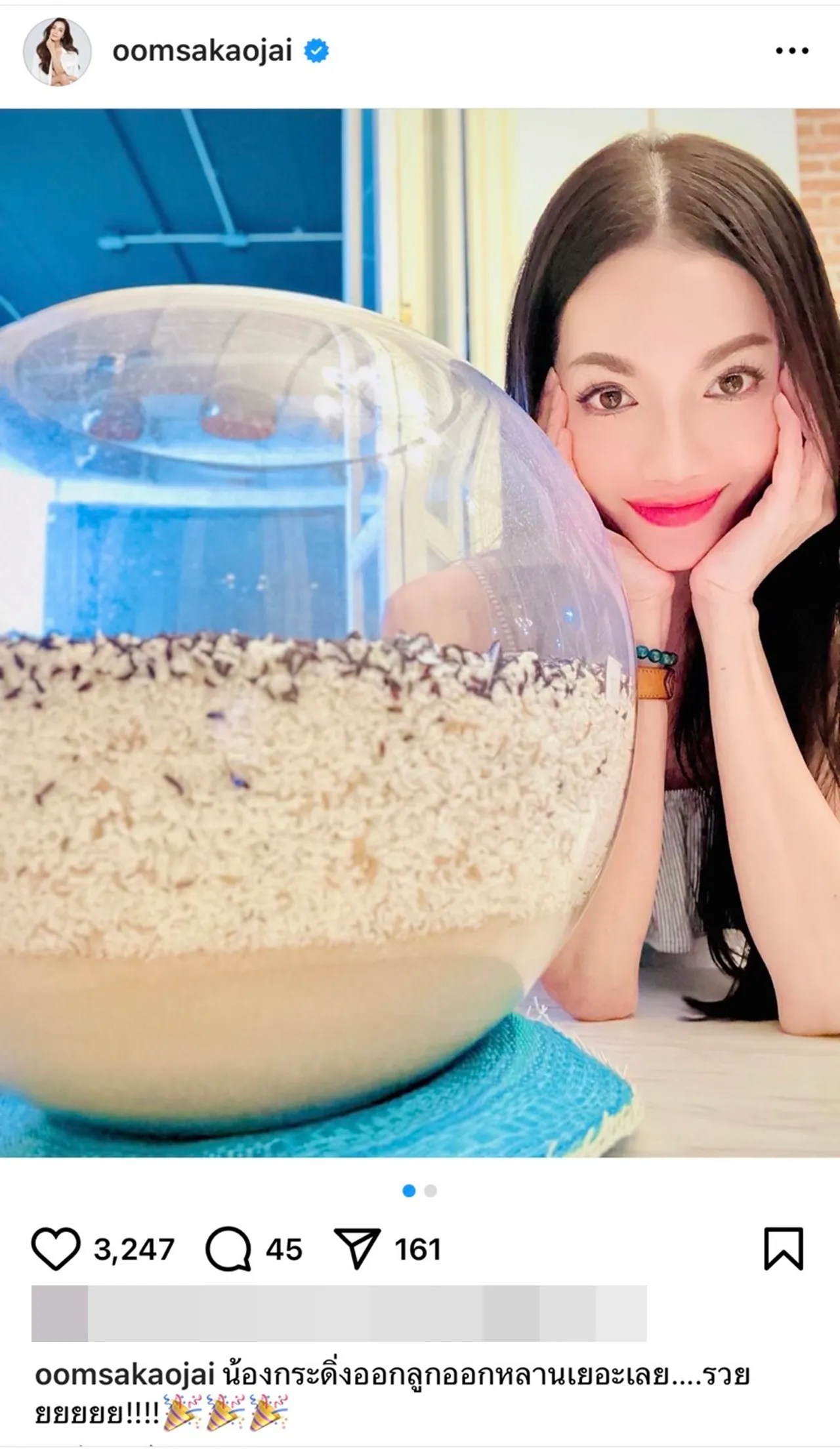 ซึ่ง อ๋อม ได้เผยภาพที่ถ่ายคู่กับโหลน้องกระดิ่ง ซึ่งภายในเห็นตัวเลขแบบชัดๆ และเขียนแคปชั่นว่า “น้องกระดิ่งออกลูกออกหลานเยอะเลย….รวยยยยยย!!!!”