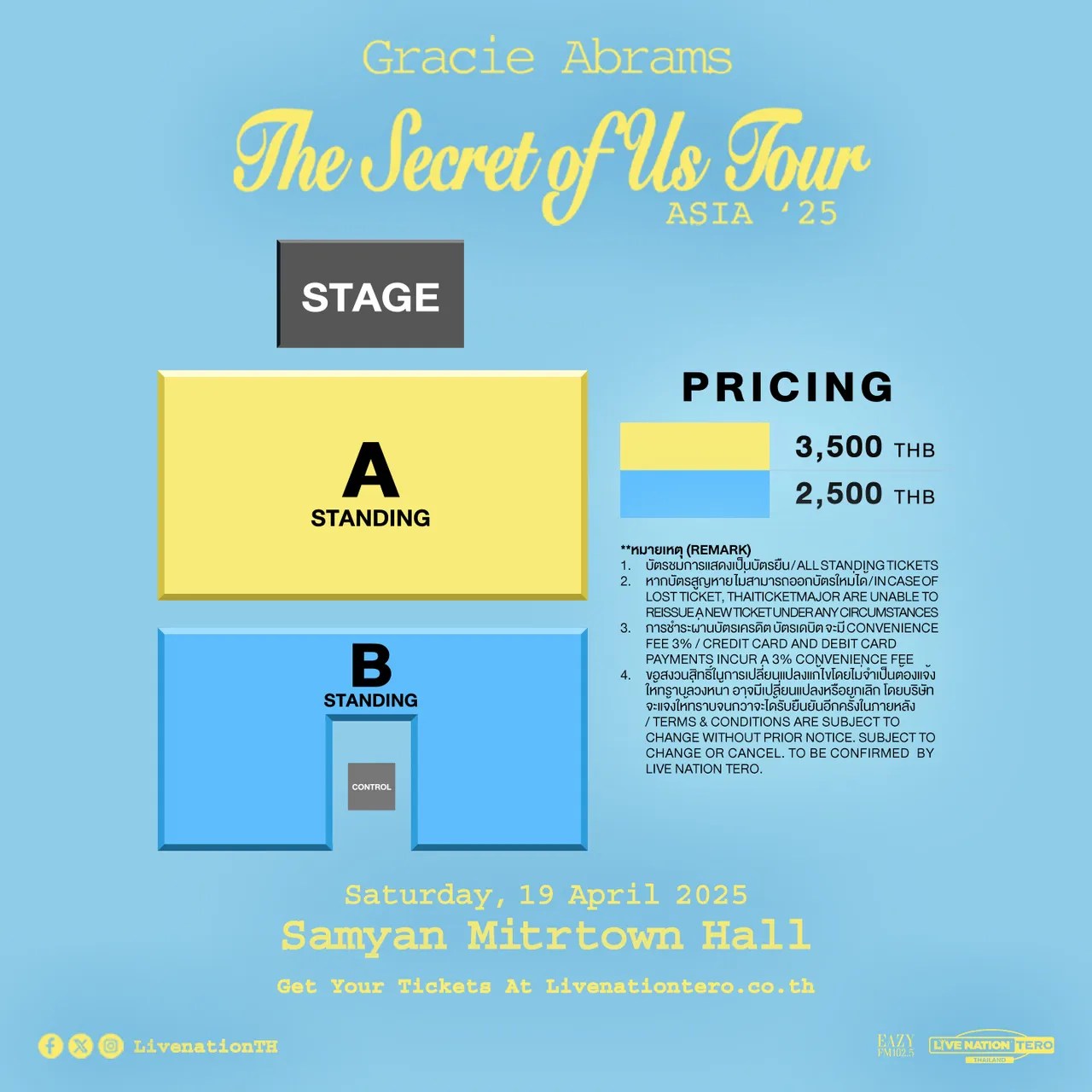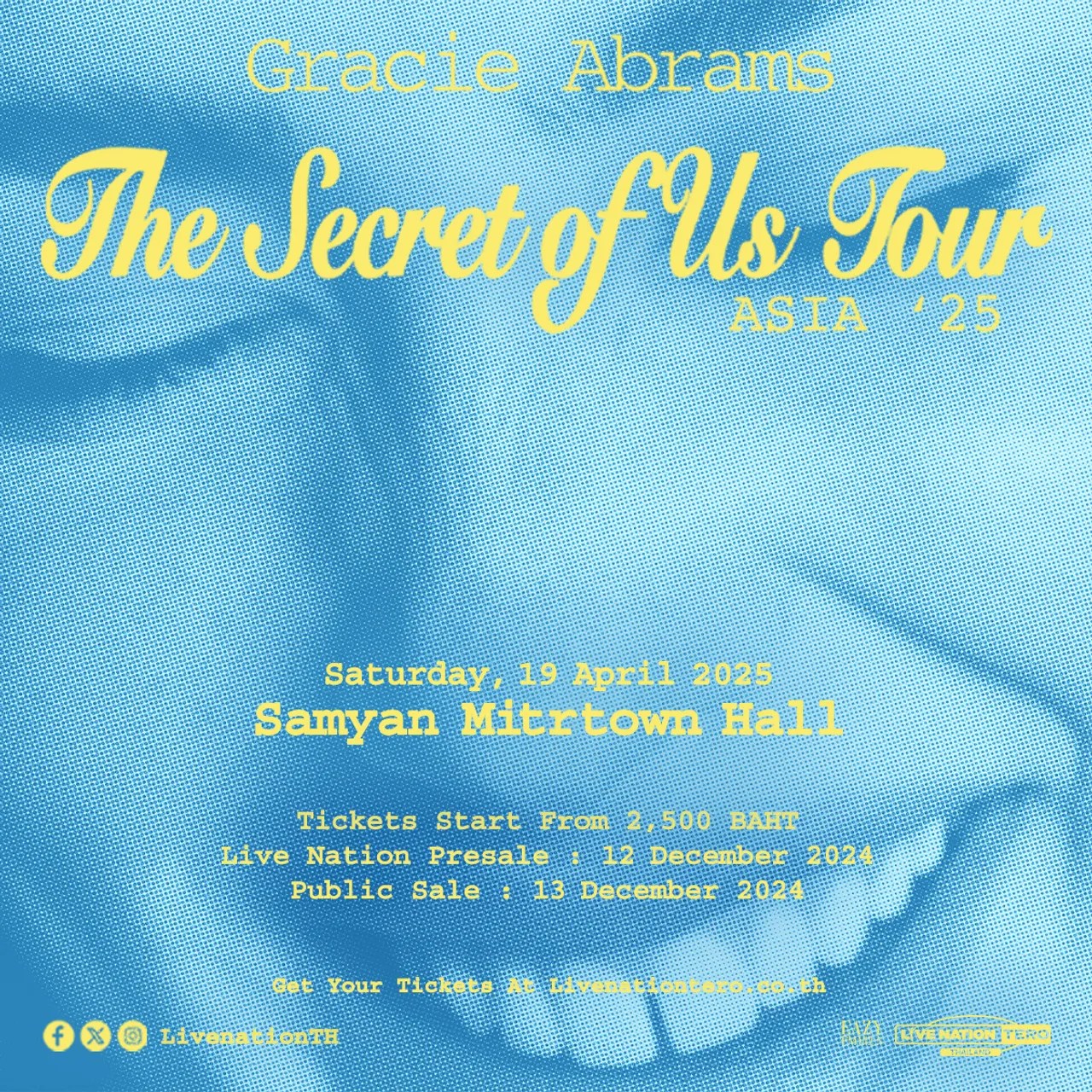 ‘The Secret of Us Tour’ คอนเสิร์ตที่ตอกย้ำความมาแรงของเธอคนนี้ ด้วยสถิติโซลเอาท์ในอเมริกา และการประกาศเอเชียทัวร์เป็นครั้งแรก แฟนๆ ชาวไทยห้ามพลาด ล็อคคิวข้ามปีก่อนไปเจอกับเธอที่‘Gracie Abrams: The Secret of Us Tour in Bangkok’ วันเสาร์ที่ 19 เมษายน 2568 ที่สามย่าน มิตรทาวน์ ฮอลล์ บัตรราคา 2,500 และ 3,500 บาท สมาชิกไลฟ์ เนชั่น เทโร รับสิทธิ์ซื้อบัตรรอบพรีเซลส์ในวันพฤหัสบดีที่ 12 ธันวาคม (10.00 – 22.00 น.) ทาง livenationtero.co.th เริ่มจำหน่ายบัตรรอบทั่วไป วันศุกร์ที่ 13 ธันวาคม 10.00 น. เป็นต้นไปทาง thaiticketmajor.com เท่านั้น และจะเปิดจำหน่ายทางเคาน์เตอร์ไทยทิคเก็ตเมเจอร์ทุกสาขา ในวันเสาร์ที่ 14 ธันวาคม 2567 เวลา 10.00 น. เป็นต้นไป