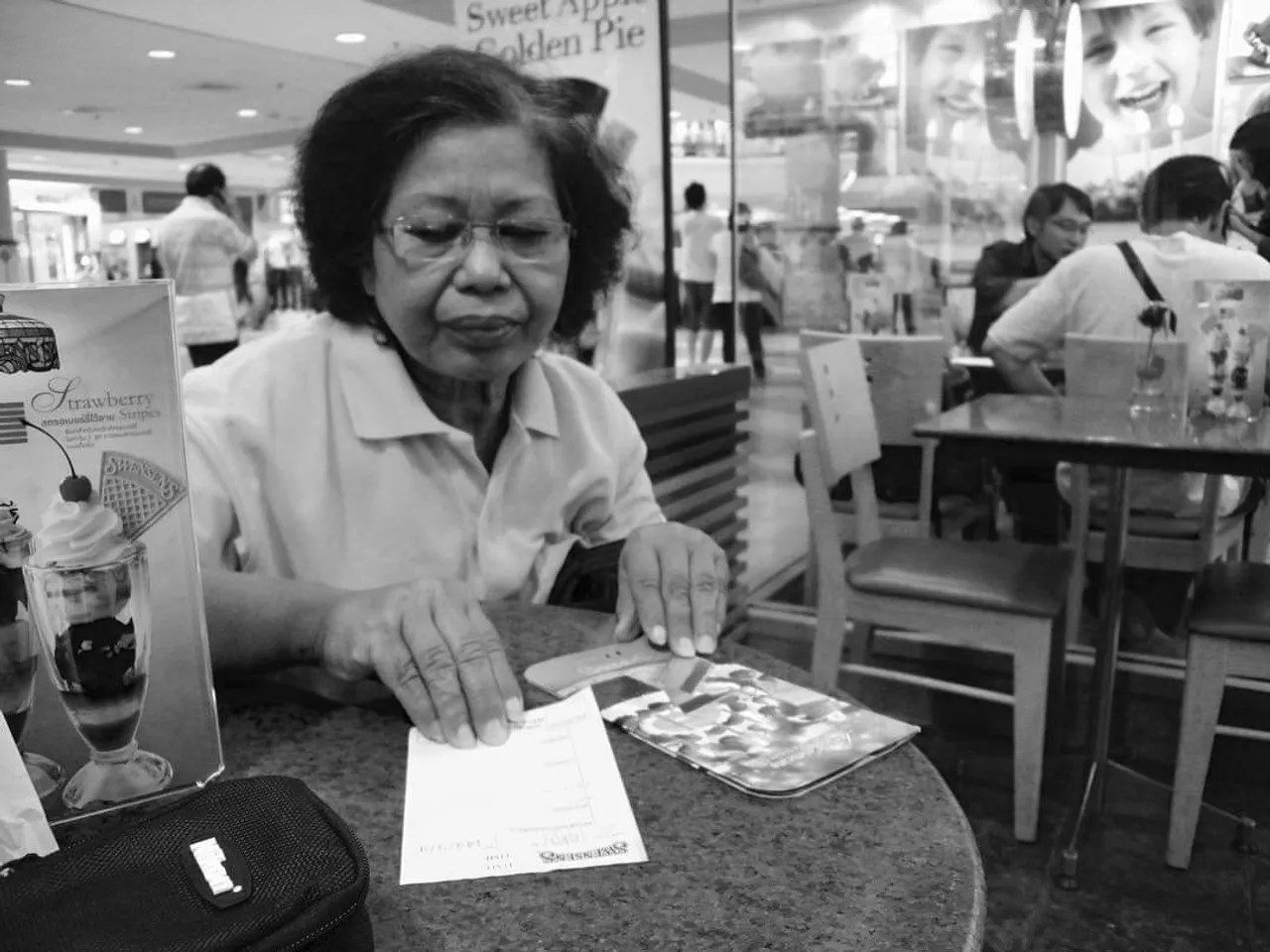 แล้วผมก็มีความสุขมาก และก็ไปนั่งกินสเวนเซ่นกัน แล้วผมก็ถ่ายรูป รูปแรกเป็นขาวดำถ่ายเขา ตอนนั้นแค่รู้สึกแบบ พอโตมา เราทำอะไรลงไป เราเอาเงิน ทำงั้นได้ไง (เสียงสั่น) ทุกวันนี้เห็นรูปนั้นไม่ได้เลย เรารู้สึกว่าเรา ใช้คำว่าชั่วได้หรือเปล่าไม่รู้ เรารู้สึกอย่างนั้น ทำไมเราชั่วอย่างนี้ คนเหนือเขาว่า “ค่ำป้อค่ำแม่” (ลูกไม่รักดี)