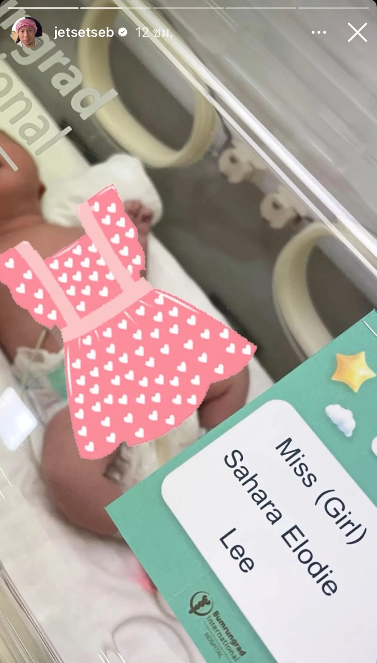 โดยคุณพ่อเซบาสเตียน ได้เผยภาพสาวน้อยที่อยู่ในตู้อบที่เห็นแค่นิ้วมือและแก้มยุ้ย ๆ ผ่านไอจีสตอรี่ แม้ว่าจะยังเห็นหน้าไม่ชัด แต่รู้เลยว่า สาวน้อย Sahara Elodie Lee ตัวแน่นจ้ำม่ำ แก้มมาเต็ม