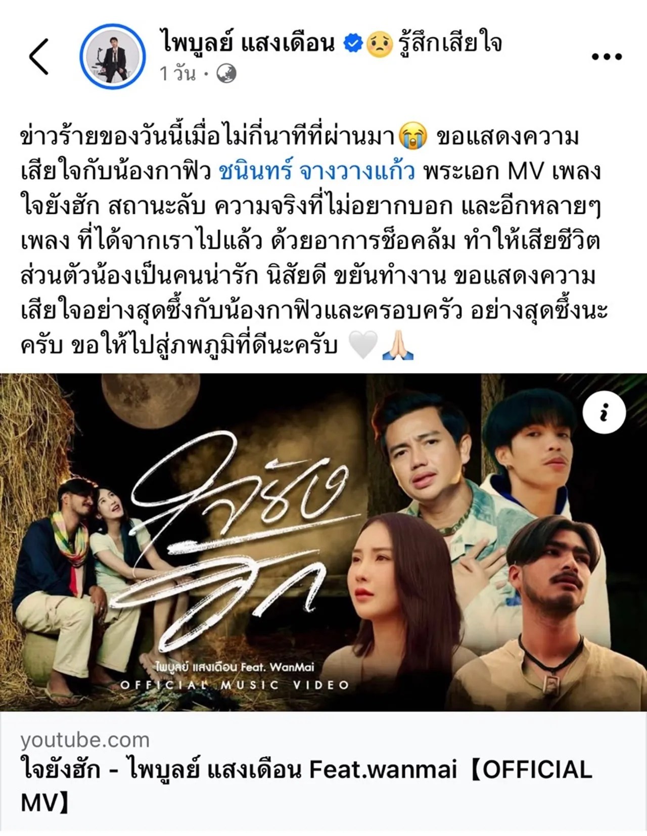 ช็อกวงการลูกทุ่งอีสาน กาฟิว ชนินทร์ พระเอก MV เสียชีวิต ครูไพบูลย์โพสต์อาลัย
