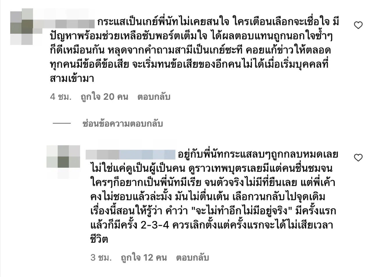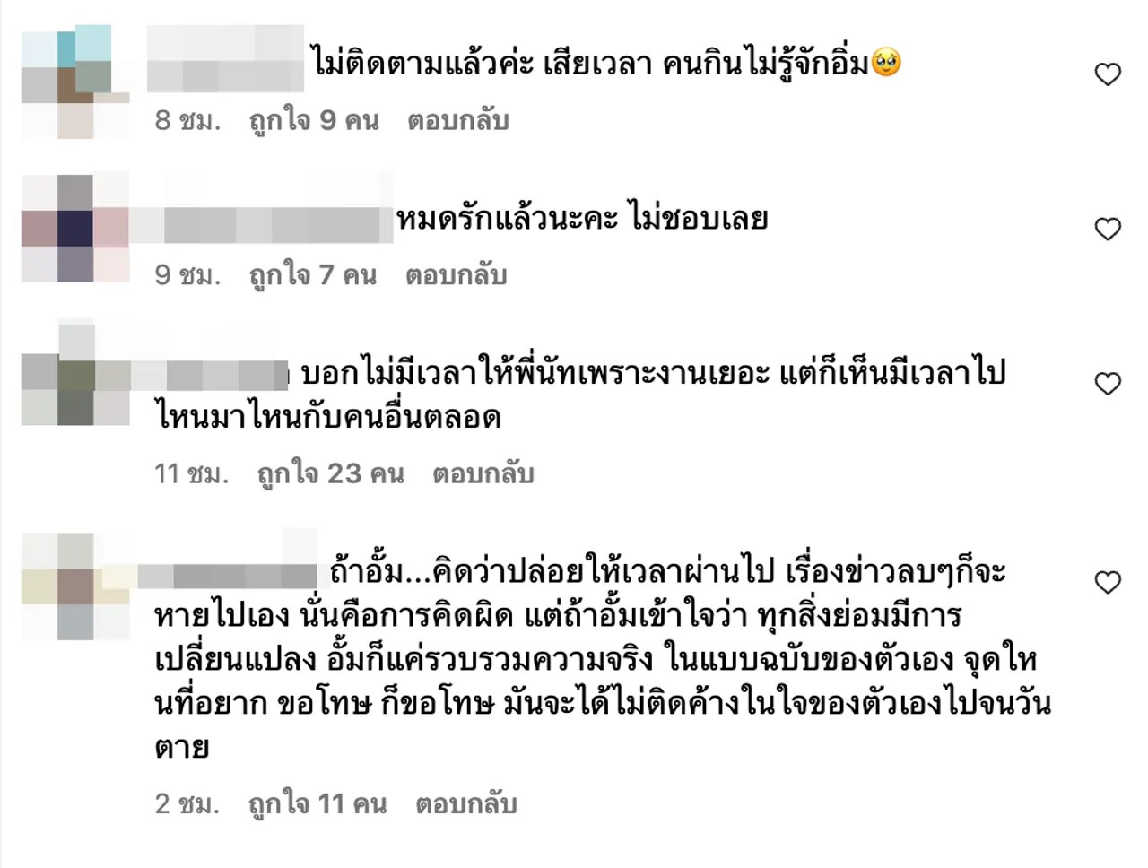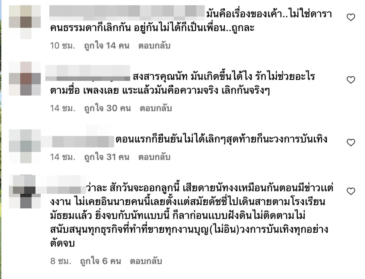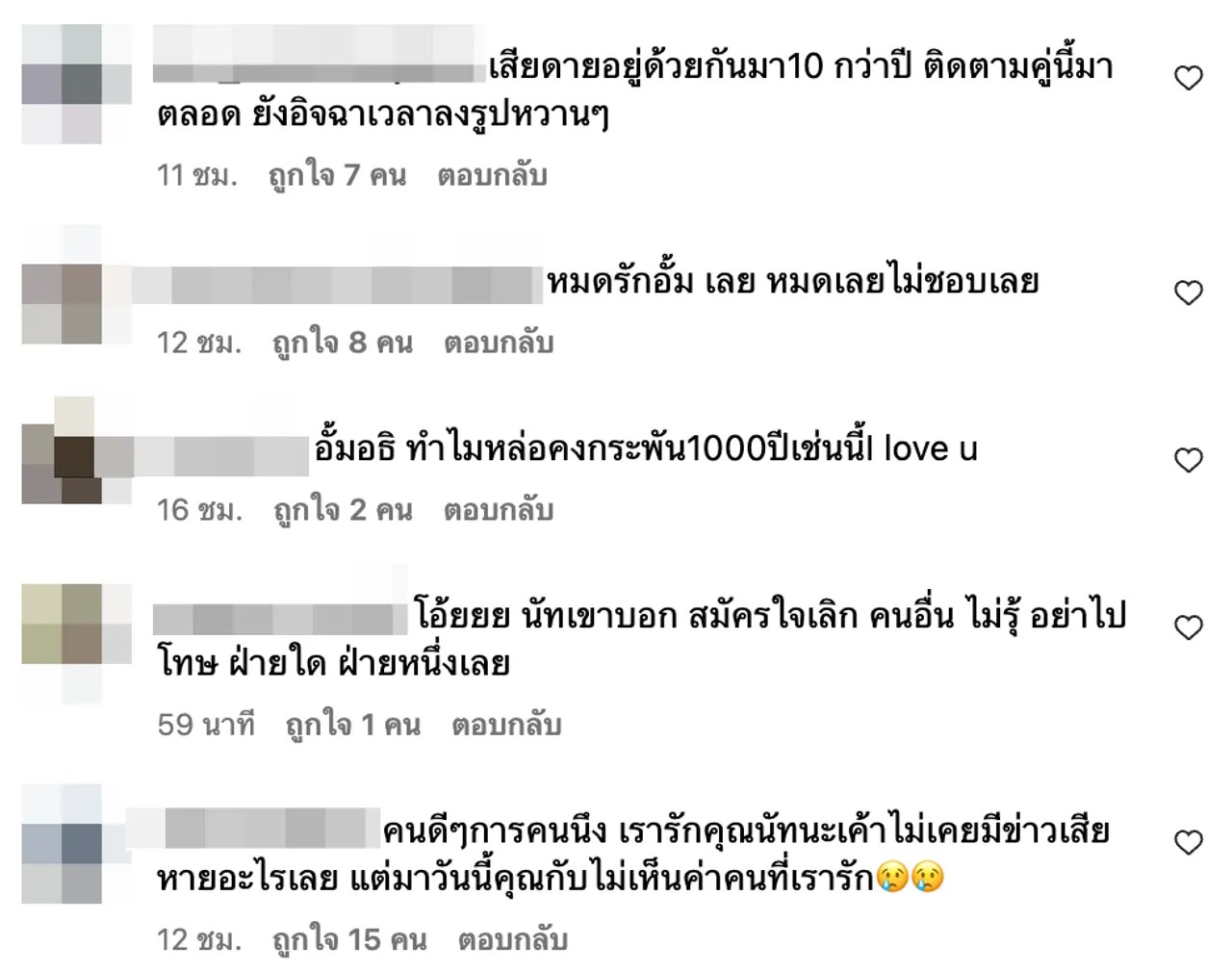 “หมดรักอั้ม เลย หมดเลยไม่ชอบเลย, เสียดายอยู่ด้วยกันมา10 กว่าปี ติดตามคู่นี้มาตลอด ยังอิจฉาเวลาลงรูปหวานๆ, ตอนแรกก็ยืนยันไม่ได้เลิกๆ สุดท้ายก็นะวงการบันเทิง, มันคือเรื่องของเขา..ไม่ใช่ดารา คนธรรมดาก็เลิกกัน อยู่กันไม่ได้ก็เป็นเพื่อน..ถูกละ,
