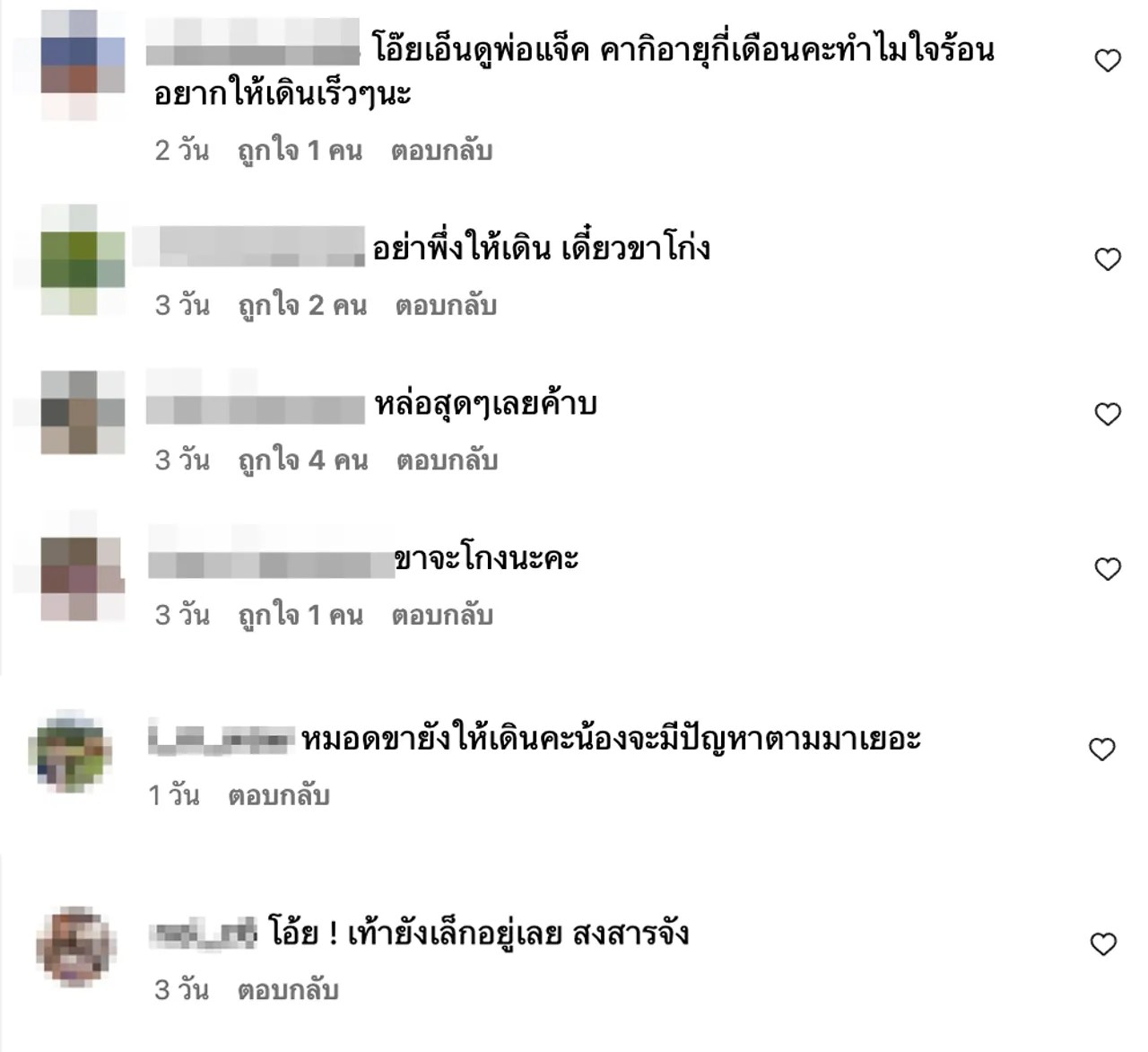 “อย่าพึ่งให้เดิน เดี๋ยวขาโก่ง, ขาจะโก่งนะคะ, โอ้ย เท้ายังเล็กอยู่เลย สงสารจัง, หมอเขายังไม่ให้เดินค่ะ น้องจะมีปัญหาตามมาเยอะ”