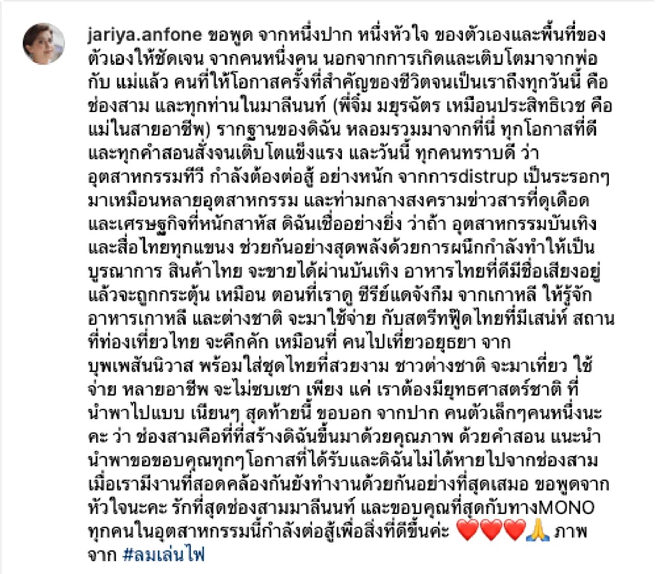 เพิ่งจะเปิดตัวไปอย่างยิ่งใหญ่อลังการ สำหรับงานเปิดตัวละครของช่อง MONO ซึ่งมีเหล่าผู้จัดละครของช่อง 3 รวมไปถึงนักแสดงของช่อง 3 อีกหลายสิบชีวิตไปร่วมในงานนั้น ซึ่งทำให้เกิดกระแสพูดถึงอยู่ไม่น้อย ล่าสุด นก จริยา หนึ่งในผู้จัดละครที่ไปผลิตละครให้ช่อง MONO ได้โพสต์ข้อความจากใจถึงช่อง 3 เอาไว้ว่า