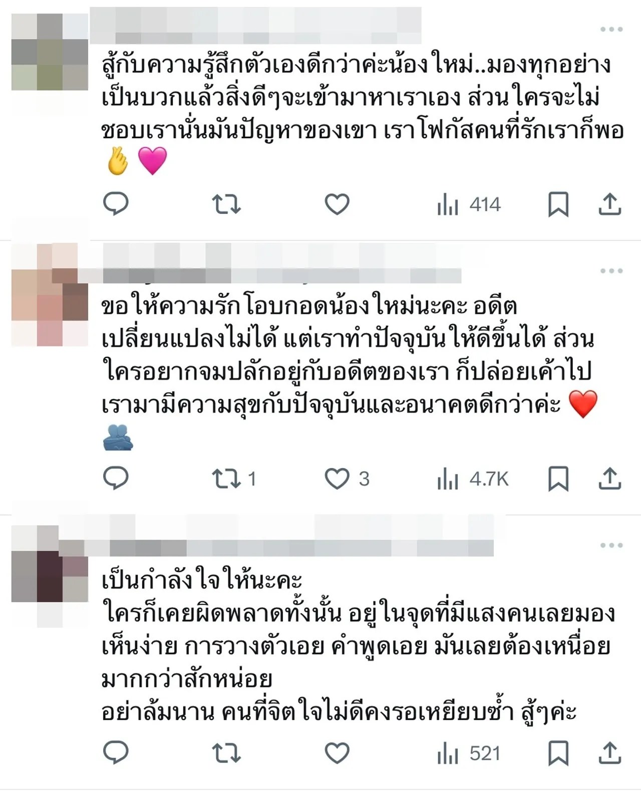 งานนี้ก็มีชาวเน็ตเข้ามาคอมเมนต์แสดงความคิดเห็นต่างๆ มากมาย อาทิ “ขอให้ความรักโอบกอดน้องใหม่นะคะ อดีตเปลี่ยนแปลงไม่ได้ แต่เราทำปัจจุบันให้ดีขึ้นได้ ส่วนใครอยากจมปลักอยู่กับอดีตของเรา ก็ปล่อยเค้าไป เรามามีความสุขกับปัจจุบันและอนาคตดีกว่าค่ะ,