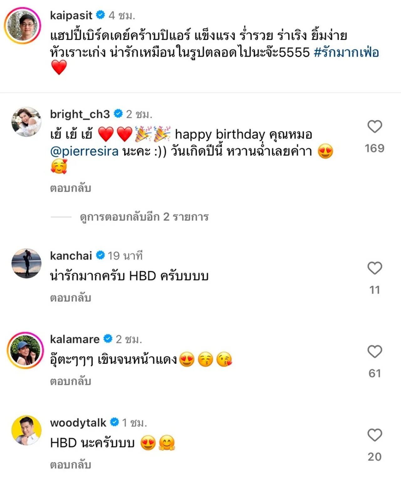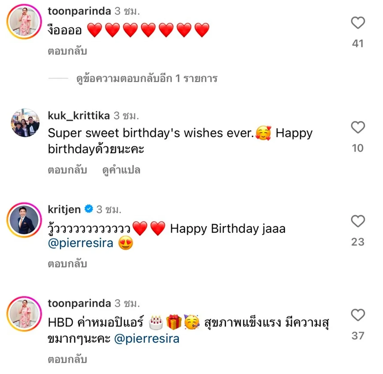 งานนี้ทำเอาผู้ประกาศข่าวสาว ไบร์ท พิชญทัฬห์ เข้ามาคอมเมนต์อวยพรวันเกิดพร้อมทั้งแซวว่า “เย้ เย้ เย้ happy birthday คุณหมอ @pierresira นะคะ :)) วันเกิดปีนี้ หวานฉ่ำเลยค่าา” ส่วน ตูน ปรินดา ผู้ประกาศข่าวสาว ก็คอมเมนต์ว่า “งืออออ” และใส่อีโมจิหัวใจสีแดงรัวๆ ผู้ประกาศข่าวหนุ่ม กฤต เจนพานิชการ ก็แซวเช่นกัน “วู้วววววววววววว Happy Birthday jaaa @pierresira”