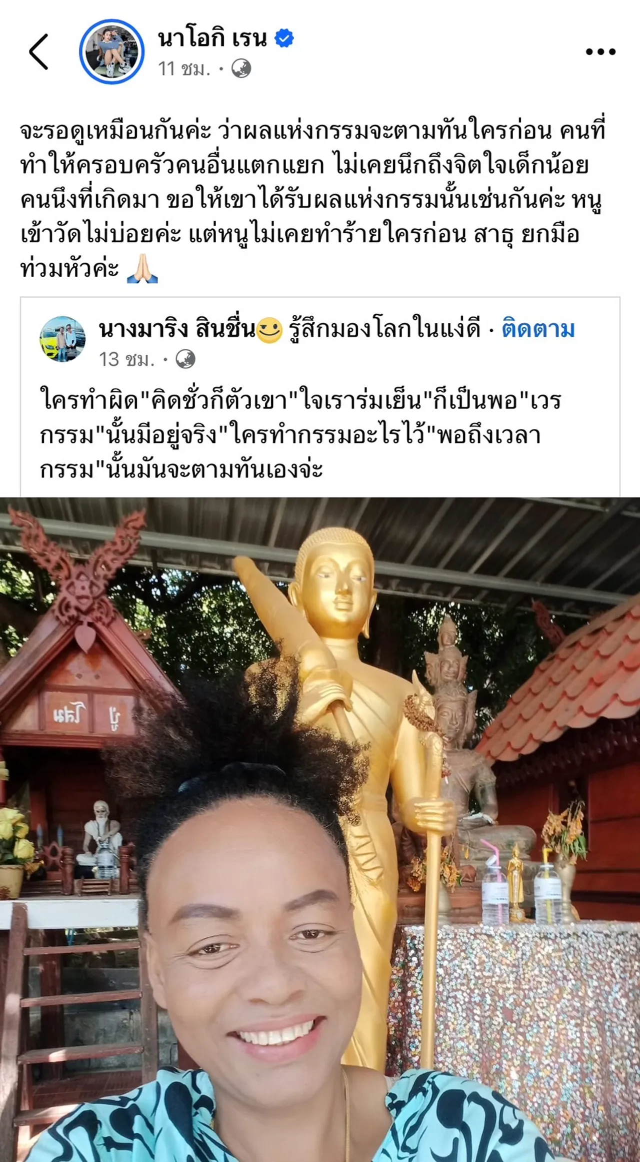 ซึ่งนัสเขียนข้อความเอาไว้ “จะรอดูเหมือนกันค่ะ ว่าผลแห่งกรรมจะตามทันใครก่อน คนที่ทำให้ครอบครัวคนอื่นแตกแยก ไม่เคยนึกถึงจิตใจเด็กน้อยคนนึงที่เกิดมา ขอให้เขาได้รับผลแห่งกรรมนั้นเช่นกันค่ะ หนูเข้าวัดไม่บ่อยค่ะ แต่หนูไม่เคยทำร้ายใครก่อน สาธุ ยกมือท่วมหัวค่ะ”