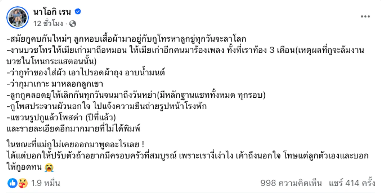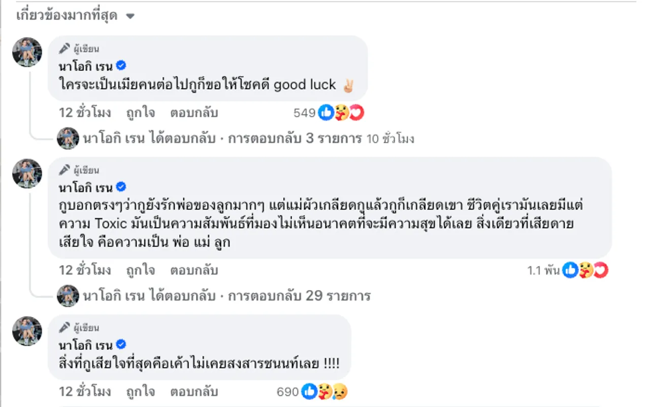 พร้อมคอมเมนต์ใต้โพสต์อีกว่า “ใครจะเป็นเมียคนต่อไปกูก็ขอให้โชคดี good luck” และ “กูบอกตรงๆ ว่ากูยังรักพ่อของลูกมากๆ แต่แม่ผัวเกลียดกูแล้วกูก็เกลียดเขา ชีวิตคู่เรามันเลยมีแต่ความ Toxic มันเป็นความสัมพันธ์ที่มองไม่เห็นอนาคตที่จะมีความสุขได้เลย สิ่งเดียวที่เสียดาย เสียใจ คือความเป็น พ่อ แม่ ลูก” และ “สิ่งที่กูเสียใจที่สุดคือเค้าไม่เคยสงสารชนนท์เลย!!!!”