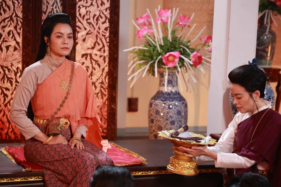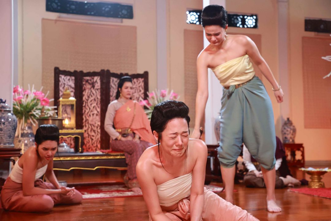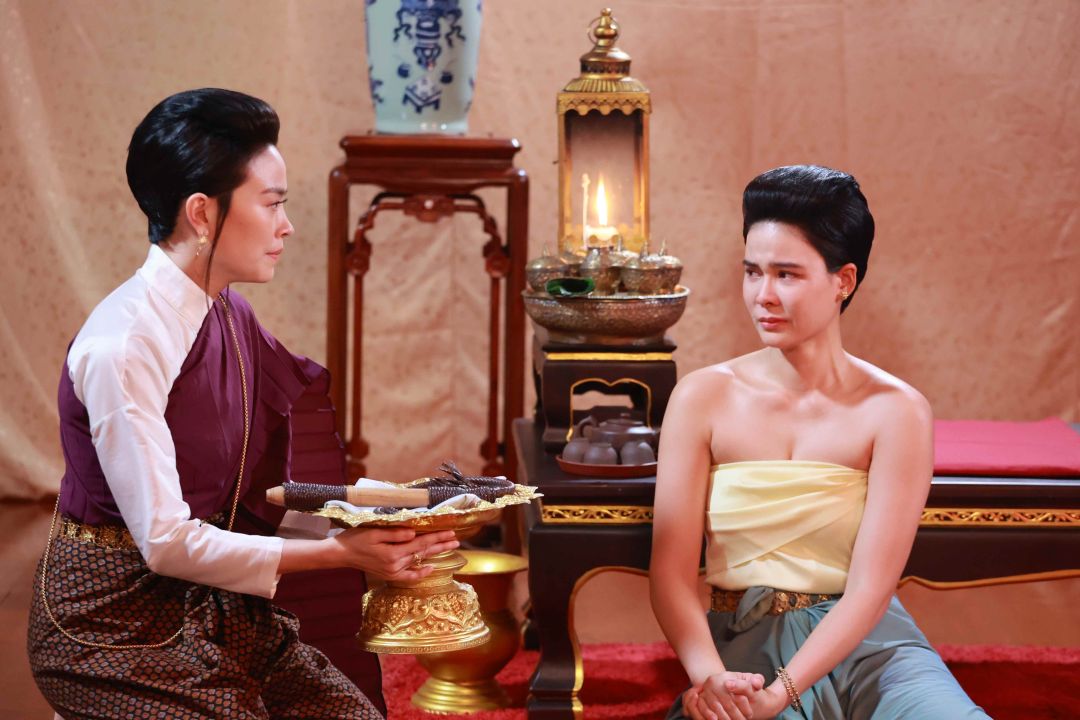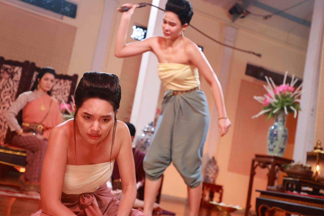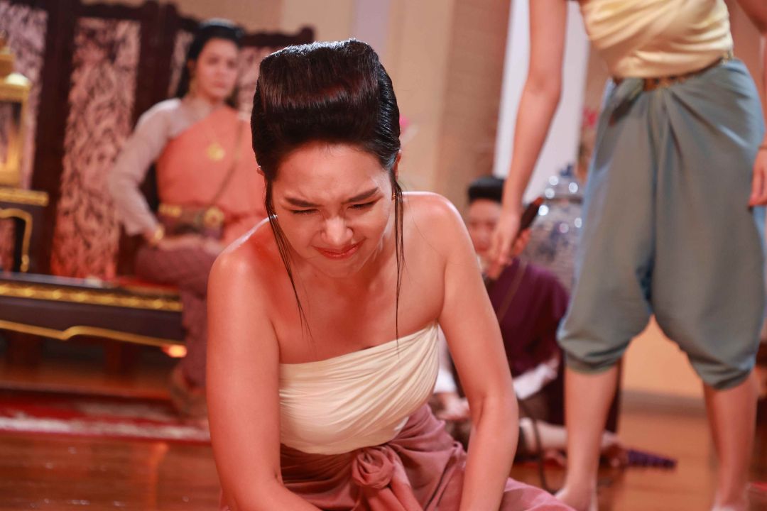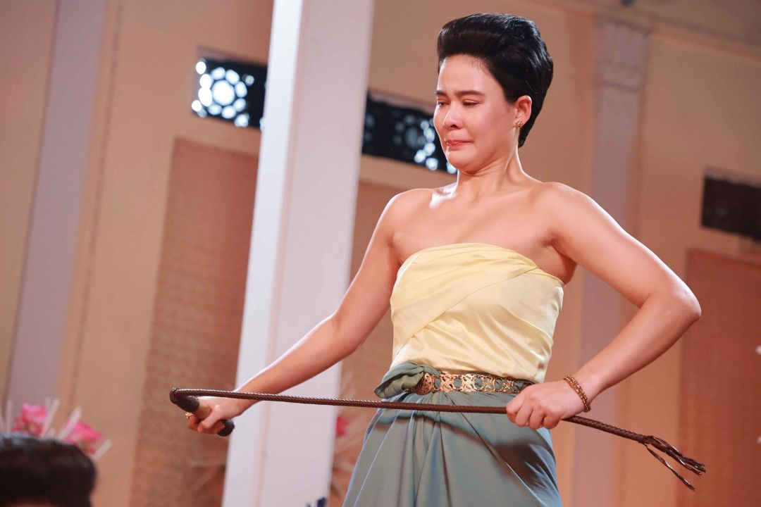 งานนี้ “พี่ถา-สถาพร นาควิไลโรจน์” ผู้จัดและผู้กำกับ บรีฟฉากนี้อย่างมุ่งมั่นตั้งใจ พี่ถาบอก “เอ๋” ว่าแม้จะเป็นคนสั่งลงโทษ แต่ก็ต้องแสดงออกถึงความหนักใจ เพราะทั้งคู่เป็นบ่าวที่รัก และต้องสกัดกั้นความรู้สึกเหล่านั้นไว้ เพราะกฎต้องเป็นกฎ และบอกทับทิมกับฟิล์มเตรียมทำอารมณ์จัดหนักจัดเต็ม ในขณะที่คนต้องฟาดแส้อย่าง “สาวใบเฟิร์น-ภัทรินทร์” ต้องซ้อมท่าฟาดแส้อย่างไรให้ไม่โดน และได้มุมกล้องที่รับหน้านักแสดงไปพร้อมๆ กันได้ ขณะที่เสียงแส้กระทบพื้น สาวฟิล์ม รีบออกตัวบอกว่า “พลาดแล้วไปต่อ ห้ามหยุดนะ ขอเจ็บทีเดียวพอ” ในขณะที่สาวทับทิม ทำสมาธิให้ซีนนี้เข้าถึงตามที่พี่ถาต้องการ เตรียมท่าเจ็บตั้งแต่ซ้อม หลังจากที่ซ้อมฟาดให้สมจริงหลายรอบ ก็ถึงเวลาทำการแสดงจริง ทั้งฟิล์มทั้งทับทิม สลับกันร้องไห้ บิ้วอารมณ์ ช่วยส่งกันไปมาแบบไม่มีใครยอมใคร รวมไปถึงใบเฟิร์นที่ต้องทำหน้าที่ฟาดแส้ ก็ปล่อยน้ำตามาเต็มไม่แพ้กัน สุดท้ายสั่งคัทผ่านเปลี่ยนซีน พากันตาบวม หน้าแดงไปหมด เรียกว่าทุ่มสุดตัวของจริง
