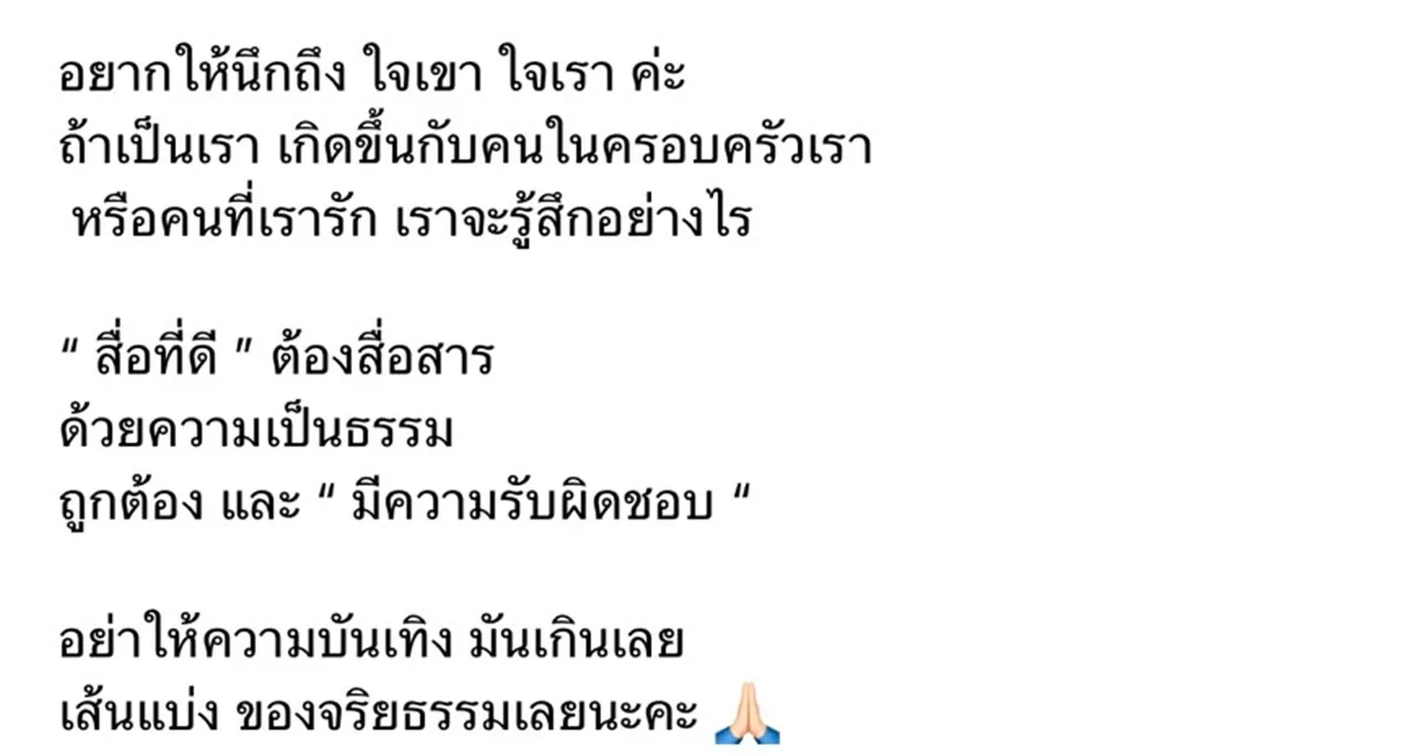 “สื่อที่ดี” ต้องสื่อสารด้วยความเป็นธรรม ถูกต้อง และ “มีความรับผิดชอบ” อย่าให้ความบันเทิงมันเกินเลยเส้นแบ่งของจริยธรรมเลยนะคะ”