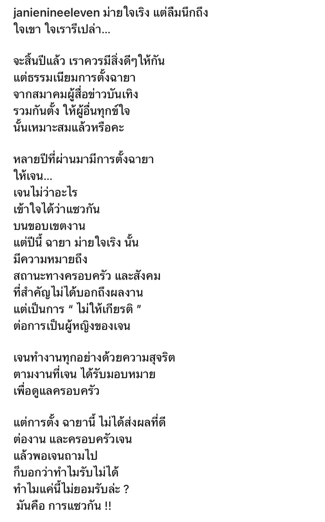 “ม่ายใจเริง แต่ลืมนึกถึงใจเขาใจเรารึเปล่า… จะสิ้นปีแล้ว เราควรมีสิ่งดีๆ ให้กัน แต่ธรรมเนียมการตั้งฉายาจากสมาคมผู้สื่อข่าวบันเทิง รวมกันตั้งให้ผู้อื่นทุกข์ใจนั้นเหมาะสมแล้วหรือคะ