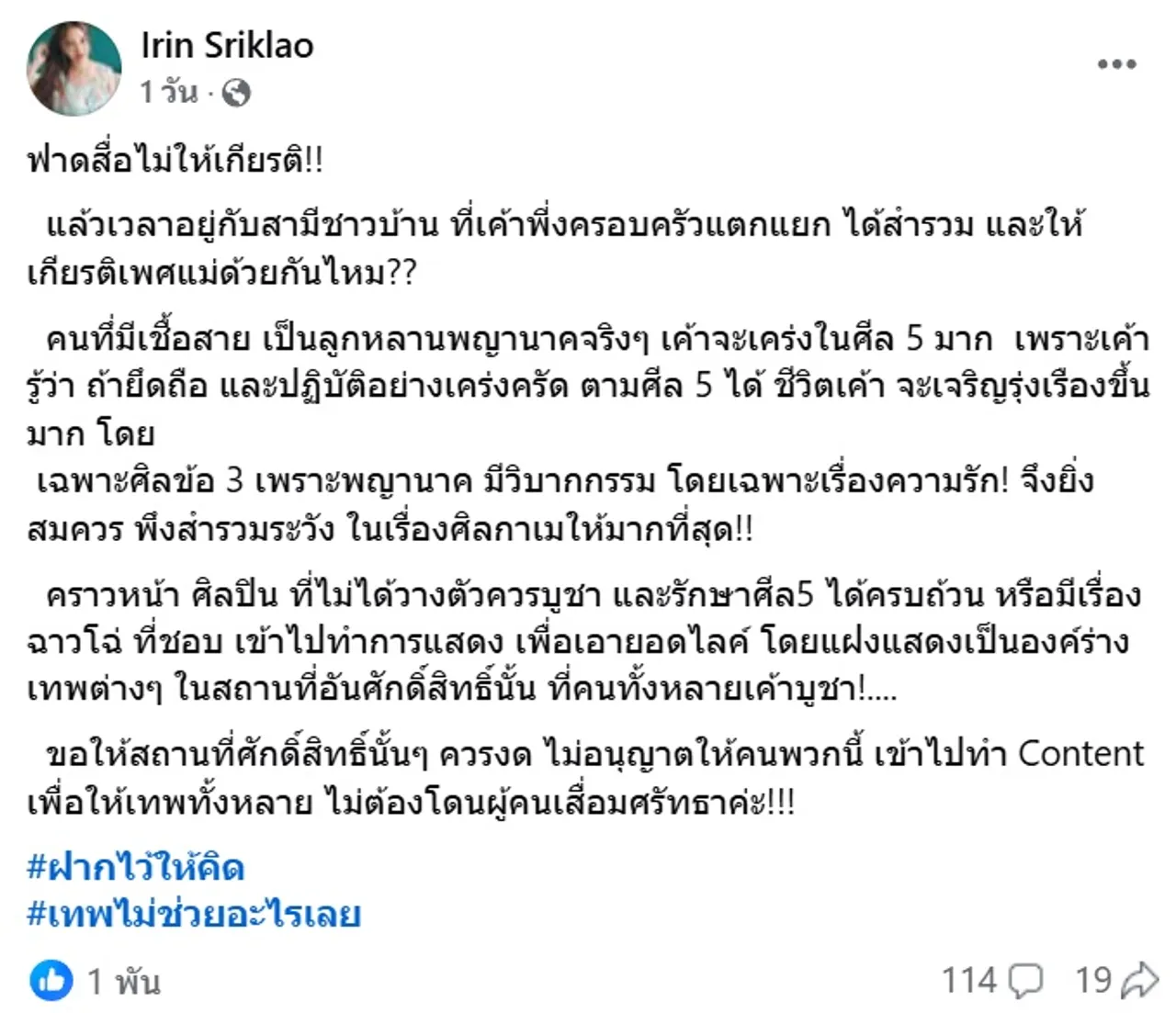 กลายเป็นประเด็นดราม่าให้ชาวเน็ตได้มุงข้ามปีกันเลยทีเดียว เมื่อนักแสดงสาวเซ็กซี่ เปิ้ล ไอริณ ศรีแกล้ว โพสต์ข้อความฟาดเดือดถึงใคร? เป็นลูกหลานพญานาค แต่เวลาอยู่กับสามีชาวบ้านที่เพิ่งครอบครัวแตกแยก ได้สำรวมและให้เกียรติเพศแม่ด้วยกันหรือไม่ พร้อมทั้งบอกว่าสถานที่ศักดิ์สิทธิ์ไม่ควรอนุญาตให้ศิลปินที่ไม่ได้วางตัวควรบูชา รักษาศีล 5 ได้ครบถ้วน เข้าไปทำคอนเทนต์เพื่อเอายอดไลค์ เพื่อให้เทพทั้งหลายไม่โดนคนเสื่อมศรัทธา
