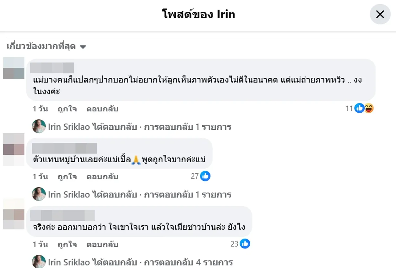 โดยมีชาวเน็ตเข้ามาแสดงความคิดเห็นมากมาย อาทิ แม่บางคนก็แปลกๆปากบอกไม่อยากให้ลูกเห็นภาพตัวเองไม่ดีในอนาคต แต่แม่ถ่ายภาพหวิว .. งงในงงค่ะ, ตัวแทนหมู่บ้านเลยค่ะแม่เปิ้ล พูดถูกใจมากค่ะแม่, จริงค่ะ ออกมาบอกว่า ใจเขาใจเรา แล้วใจเมียชาวบ้านล่ะ ยังไง, ระวังกันหน่อยนะคะ คนนี้เขาแรงไม่ตก ขอบคุณคุณเปิ้ลที่ยืนยันความจริงค่ะ, จริงค่ะ รักษาศีลข้อ 3 ไห้ได้ก่อนนน อุ้ยย ใครเอ่ย ฯลฯ
