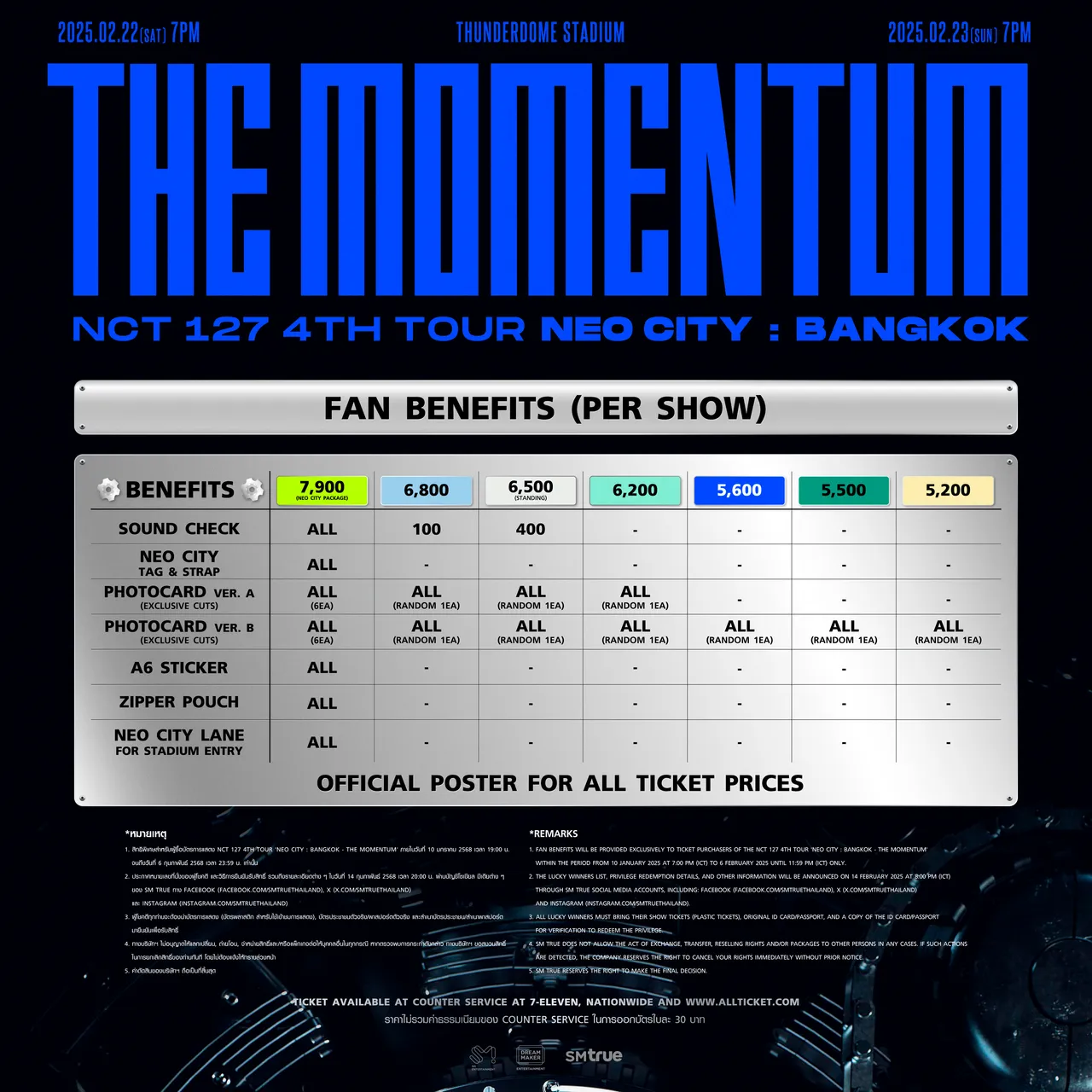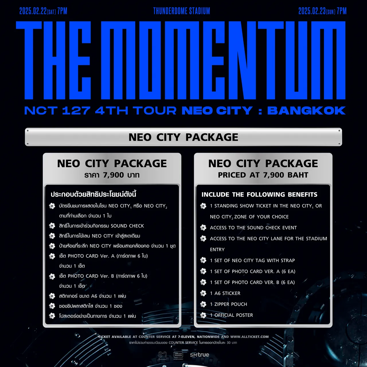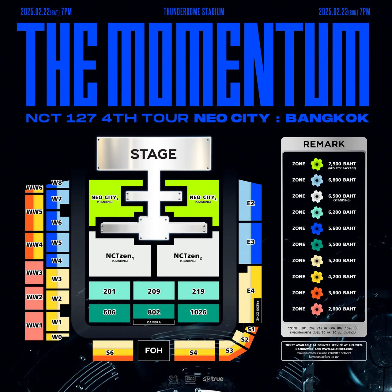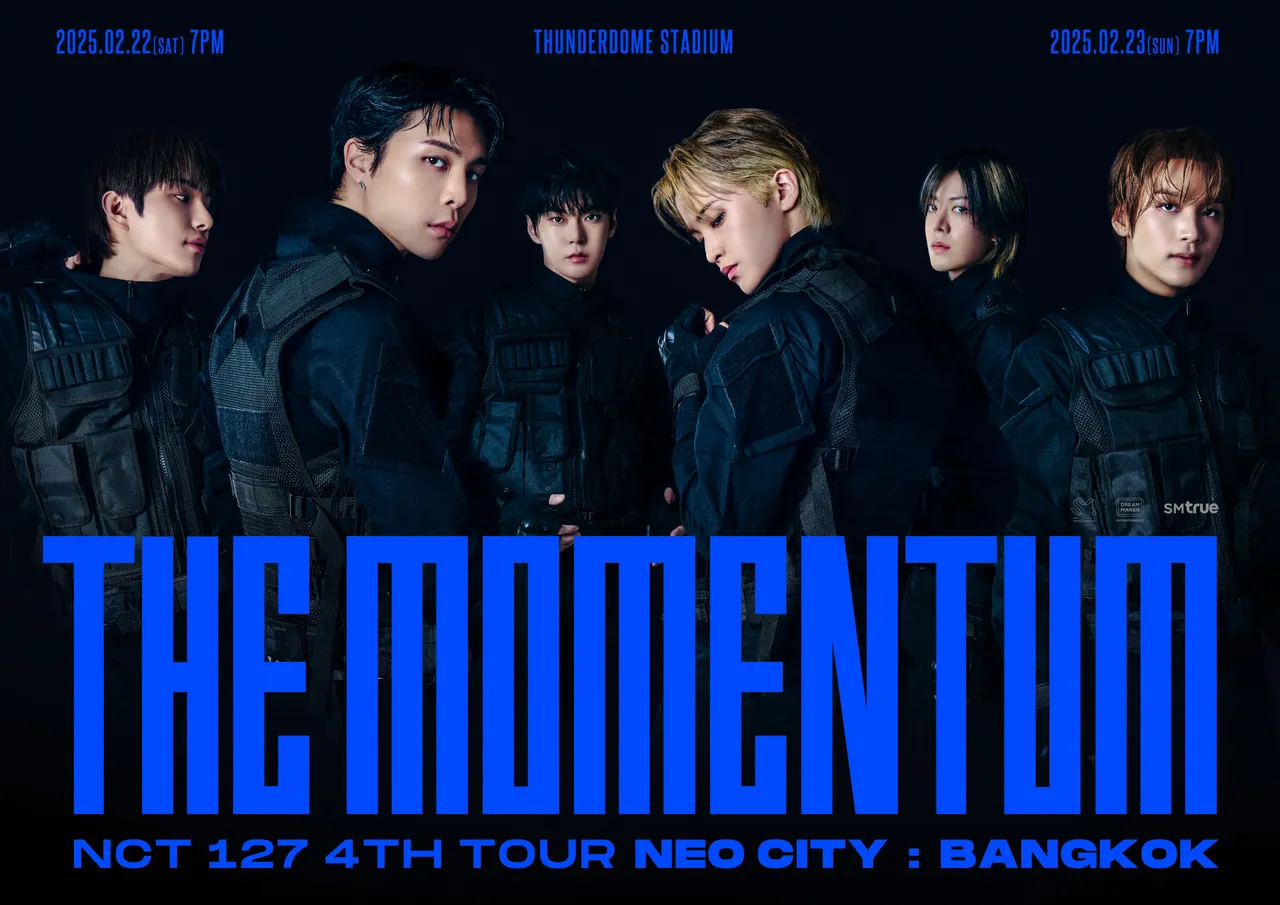 SM True ก้าวต่อไปสู่การสร้างปรากฏการณ์สุดยิ่งใหญ่ในปี 2568 พร้อมมุ่งไปข้างหน้าด้วยแรงขับเคลื่อนแบบไร้ขีดจำกัดของ NCT 127 (เอ็นซีที วันทูเซเว่น) เจ้าของสถิติศิลปินวงแรกของค่าย SM ENTERTAINMENT ที่สามารถจัดคอนเสิร์ตสเกลสเตเดียมในประเทศไทย และวงที่คว้ารางวัลใหญ่ Overall Grand Prize (Daesang) และ the Best Prize (Choewoosoosang) สำหรับสาขาคอนเสิร์ตที่ดีที่สุดจากงาน EDAILY Culture Awards ด้วยเวิลด์ทัวร์ครั้งก่อนหน้านี้อย่าง ‘NEO CITY – THE UNITY’ โดยพวกเขาจะกลับมาเปลี่ยนแปลงประวัติศาสตร์พร้อมกำหนดความสนุกครั้งใหม่ตามแบบฉบับของตัวเอง ด้วยเวิลด์ทัวร์ครั้งที่ 4 ในประเทศไทย NCT 127 4TH TOUR ‘NEO CITY : BANGKOK – THE MOMENTUM’ (เอ็นซีที วันทูเซเว่น โฟร์ท ทัวร์ ‘นีโอ ซิตี้ : แบงค็อก – เดอะ โมเมนตัม’) ในวันเสาร์ที่ 22 กุมภาพันธ์ 2568 เวลา 19:00 น. และวันอาทิตย์ที่ 23 กุมภาพันธ์ 2568 เวลา 19:00 น. ณ ธันเดอร์โดม สเตเดียม