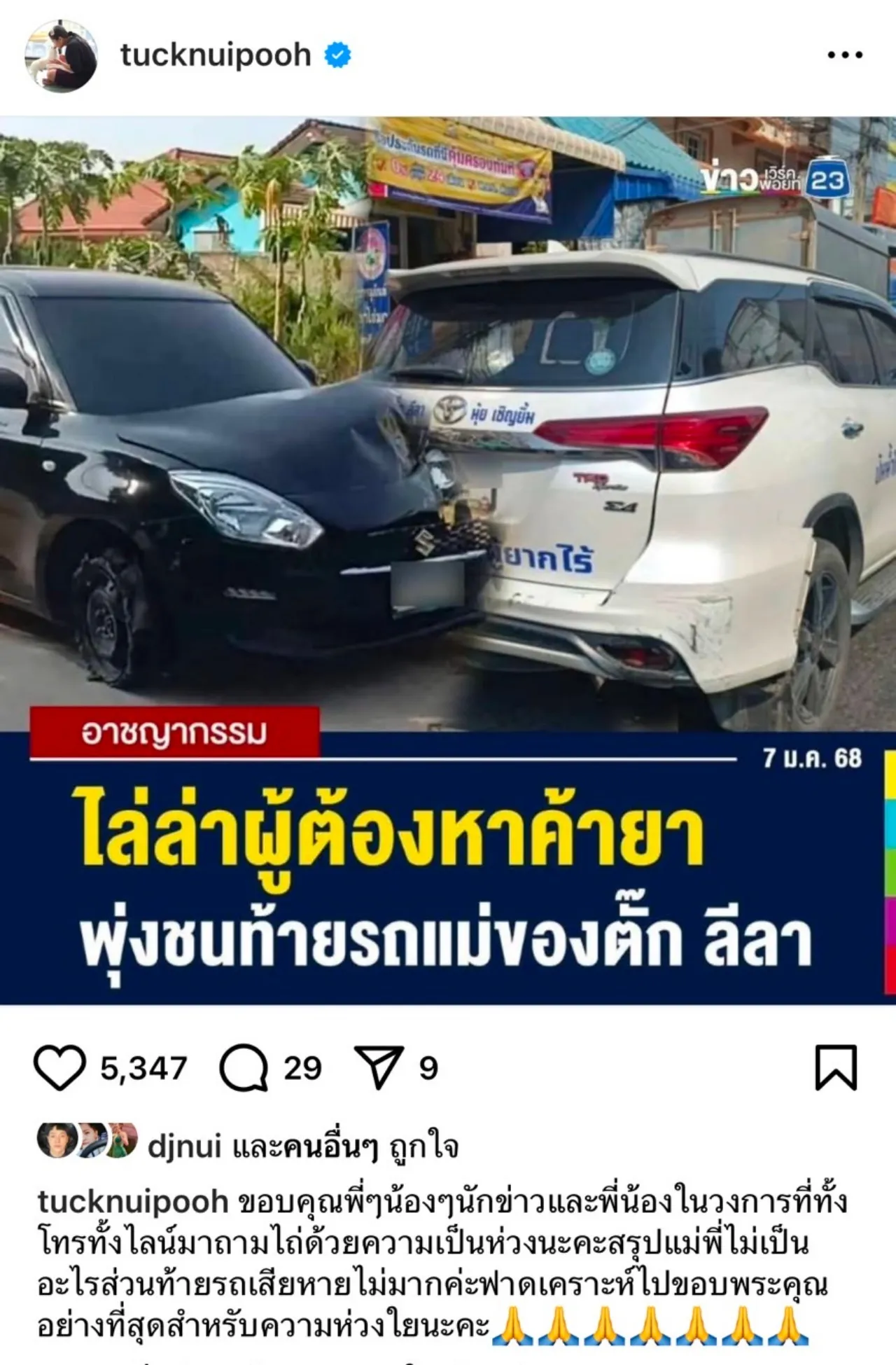 “ขอบคุณพี่ๆ น้องๆ นักข่าวและพี่น้องในวงการที่ทั้งโทรทั้งไลน์มาถามไถ่ด้วยความเป็นห่วงนะคะ สรุปแม่พี่ไม่เป็นอะไร ส่วนท้ายรถเสียหายไม่มากค่ะ ฟาดเคราะห์ไป ขอบพระคุณอย่างที่สุดสำหรับความห่วงใยนะคะ”