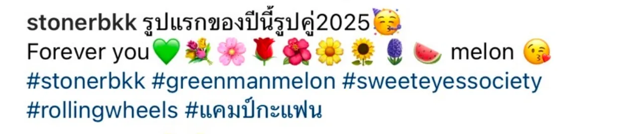 และสำหรับการเริ่มต้นปีใหม่ 2568 นี้ เบิร์ด ก็ได้โพสต์ภาพแรกของปีเป็นภาพคู่กับแตงโม พร้อมข้อความว่า “รูปแรกของปีนี้รูปคู่ 2025 Forever you melon #stonerbkk #greenmanmelon #sweeteyessociety #rollingwheels #แคมป์กะแฟน”